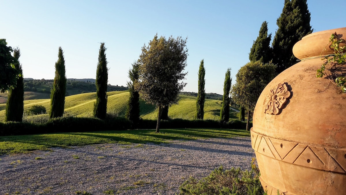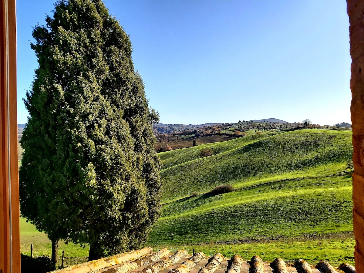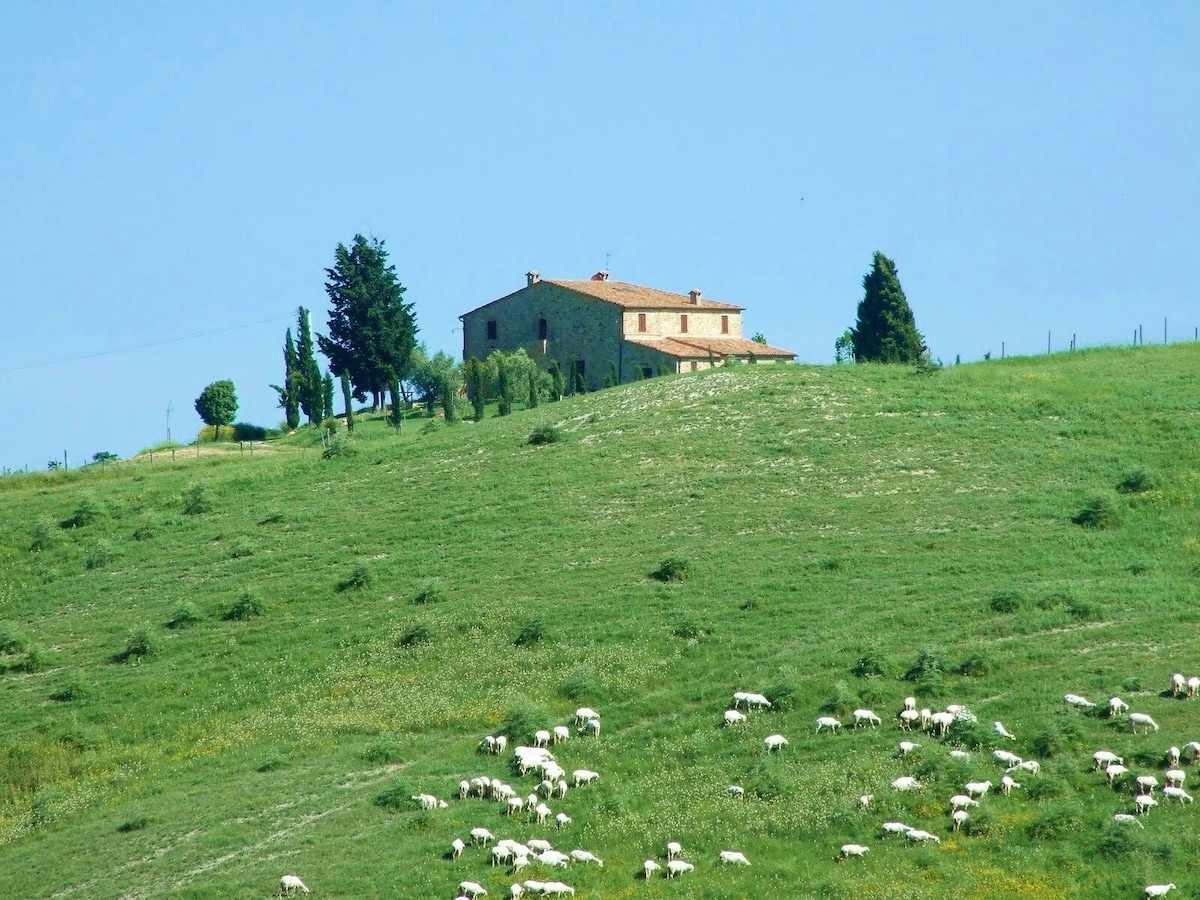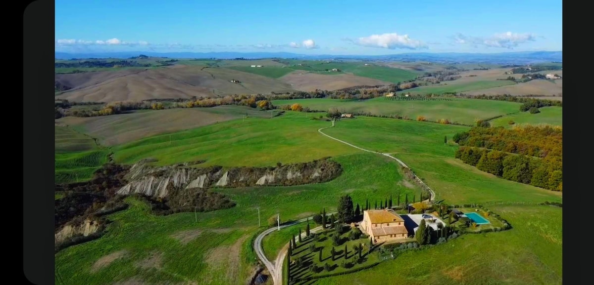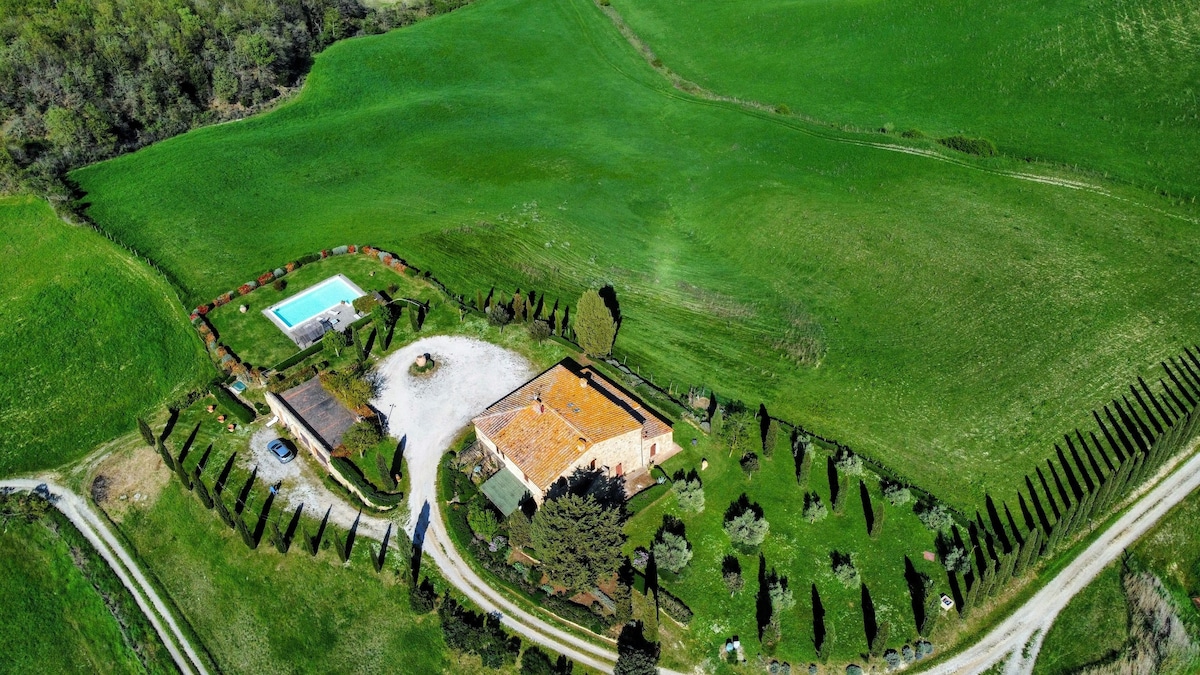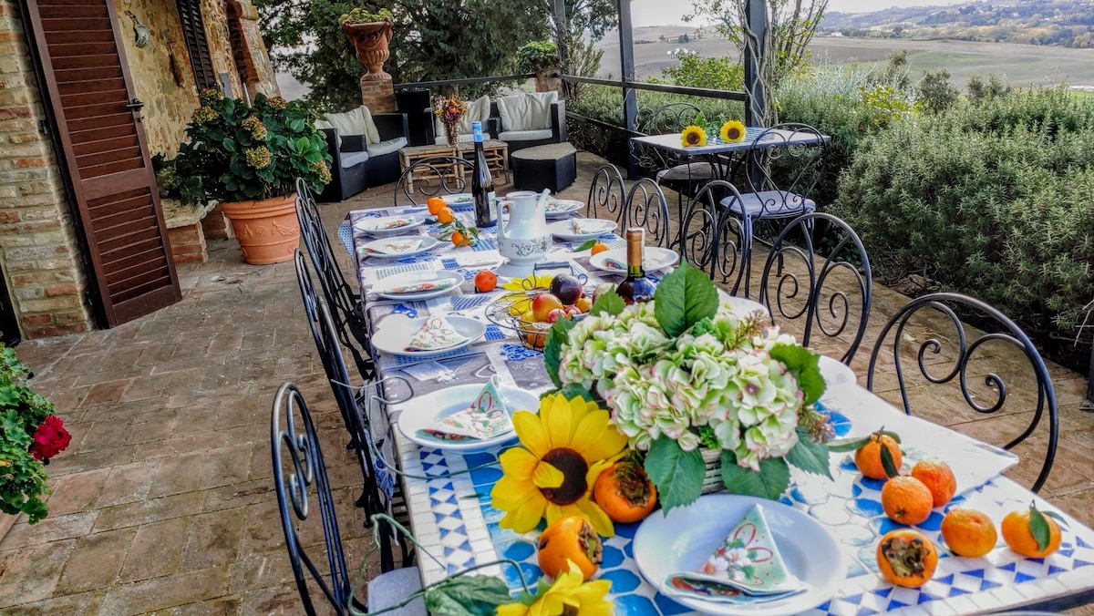 The villa has 4 beautiful double beds and one bedroom with 2 beds. On the first floor there are 3 double bedrooms and 2 bathrooms, one with hydro and shower. Two bedrooms, one double and one bedroom with 2 single beds are on the ground floor, there are 2 bathrooms on the ground floor. We rent the entire property. The spacious bedrooms have been decorated in elegant colours. On the ground floor there is a large living room of about 60 square meters with 3 sofas and a large table, there is a large 75-inch satellite TV, a stereo radio and a bluetooth speaker for your relaxation. Next door is the dining room about 30 square meters with a fantastic traditional fireplace, the dining room leads to the pergola equipped with 2 sofas and a large table for dining and you can admire the breathtaking views of the rolling Tuscan hills all around and hear the sound of silence.
