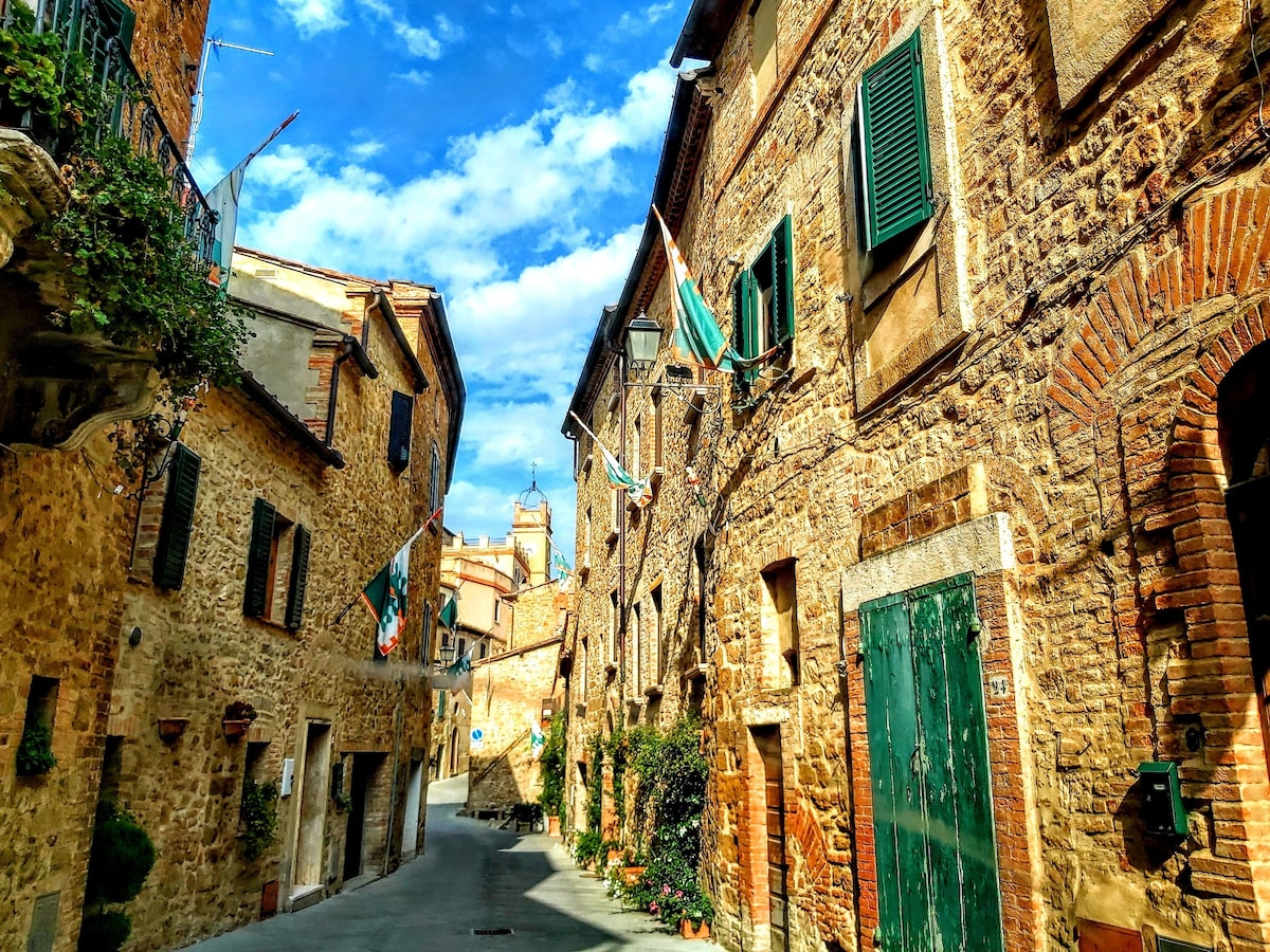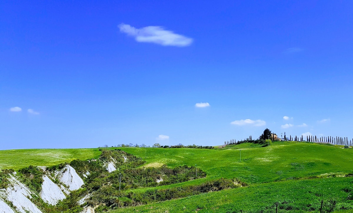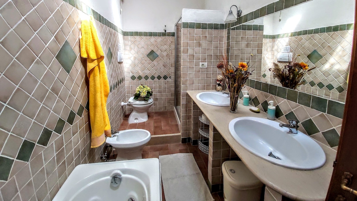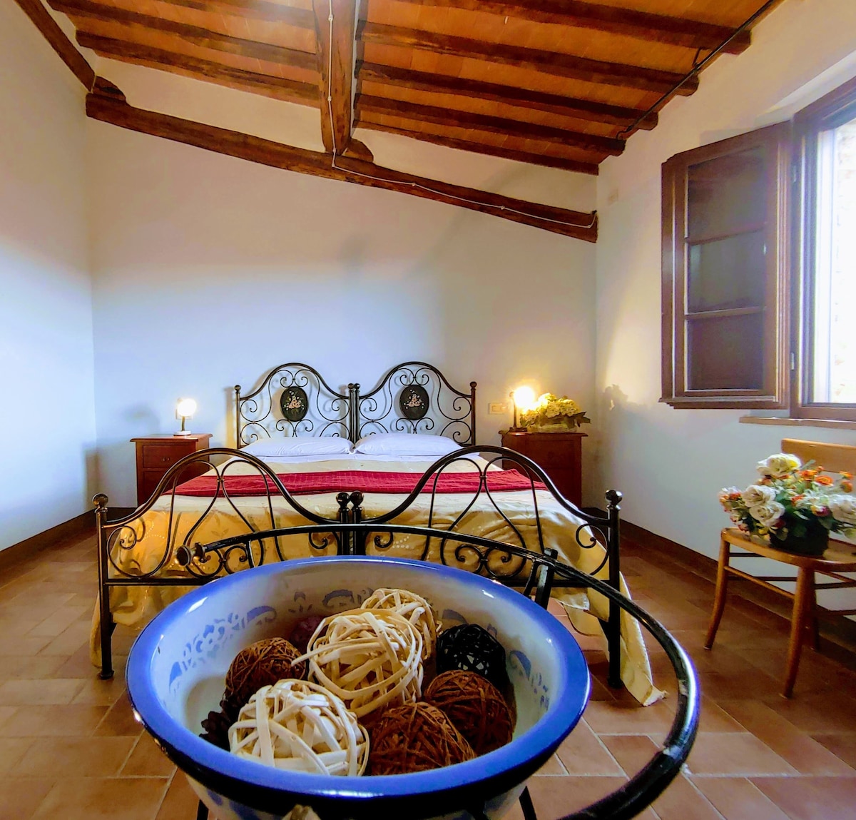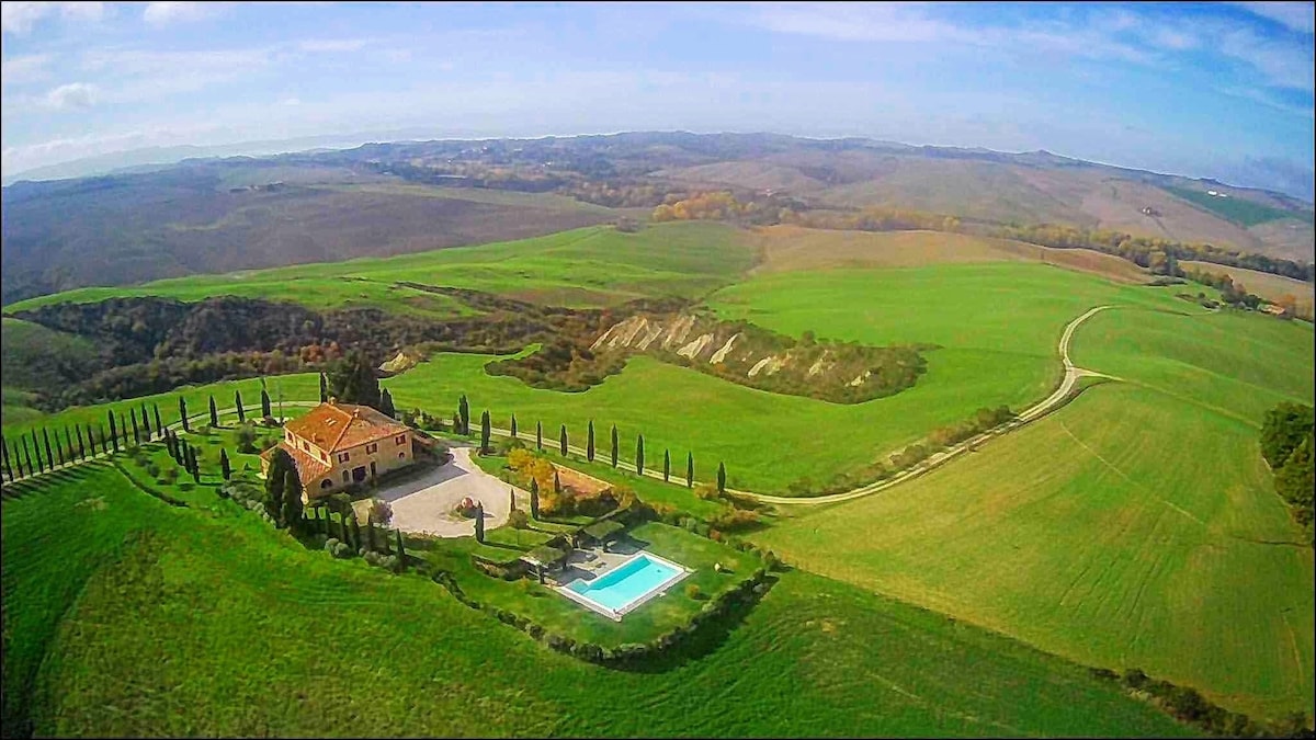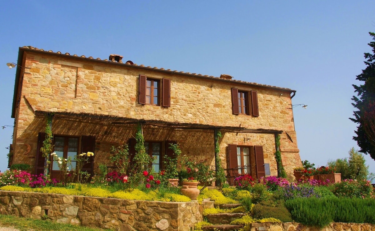 The villa has 4 beautiful double beds and one bedroom with 2 beds. On the first floor there are 3 double bedrooms and 2 bathrooms, one with hydro and shower. Two bedrooms, one double and one bedroom with 2 single beds are on the ground floor, there are 2 bathrooms on the ground floor. We rent the entire property. The spacious bedrooms have been decorated in elegant colours. On the ground floor there is a large living room of about 60 square meters with 3 sofas and a large table, there is a large 75-inch satellite TV, a stereo radio and a bluetooth speaker for your relaxation. Next door is the dining room about 30 square meters with a fantastic traditional fireplace, the dining room leads to the pergola equipped with 2 sofas and a large table for dining and you can admire the breathtaking views of the rolling Tuscan hills all around and hear the sound of silence.