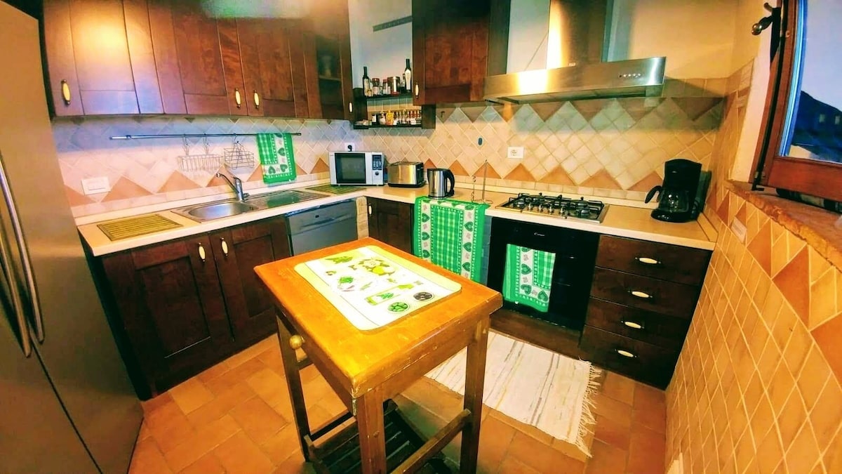 Between the dining rooms and the living room there is the kitchen which is equipped with all comforts (90 cm oven, 90 cm gas hob, dishwasher, toaster, kettle, American coffee, espresso coffee machine and mocha). Inside the living room there is a corner with another 4 burners and another sink.