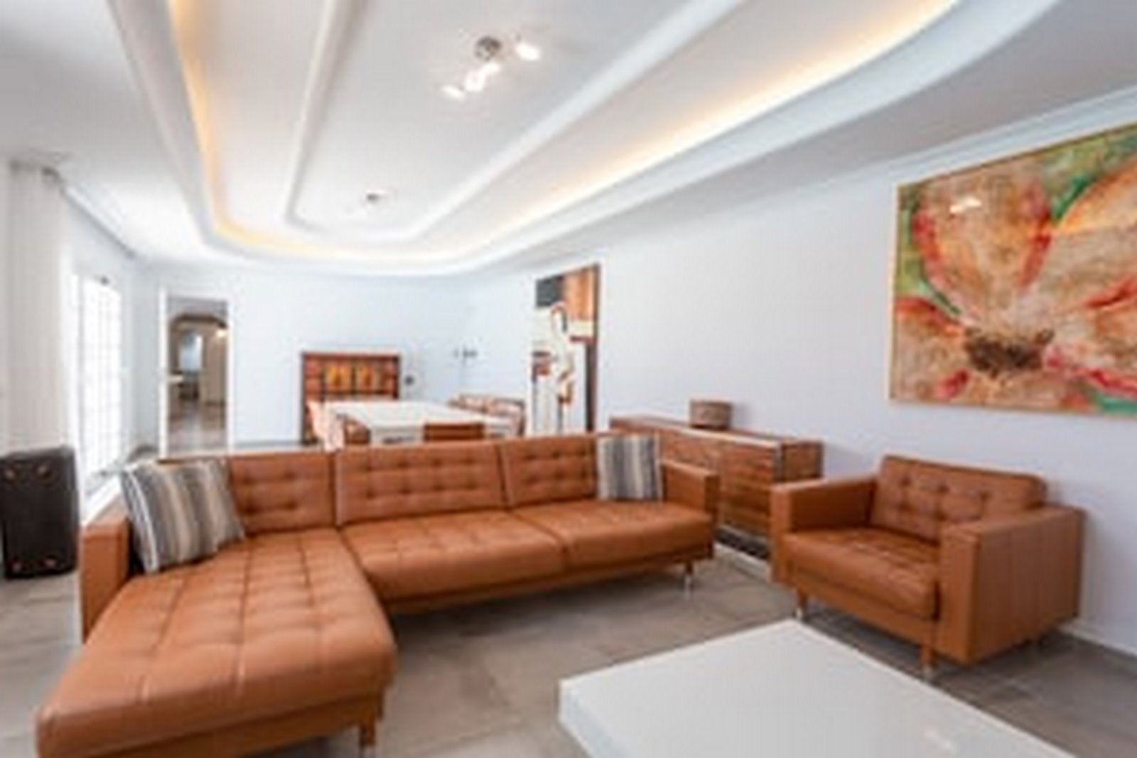 Huge living area with sofas, tables and chairs, TV and wi-fi.