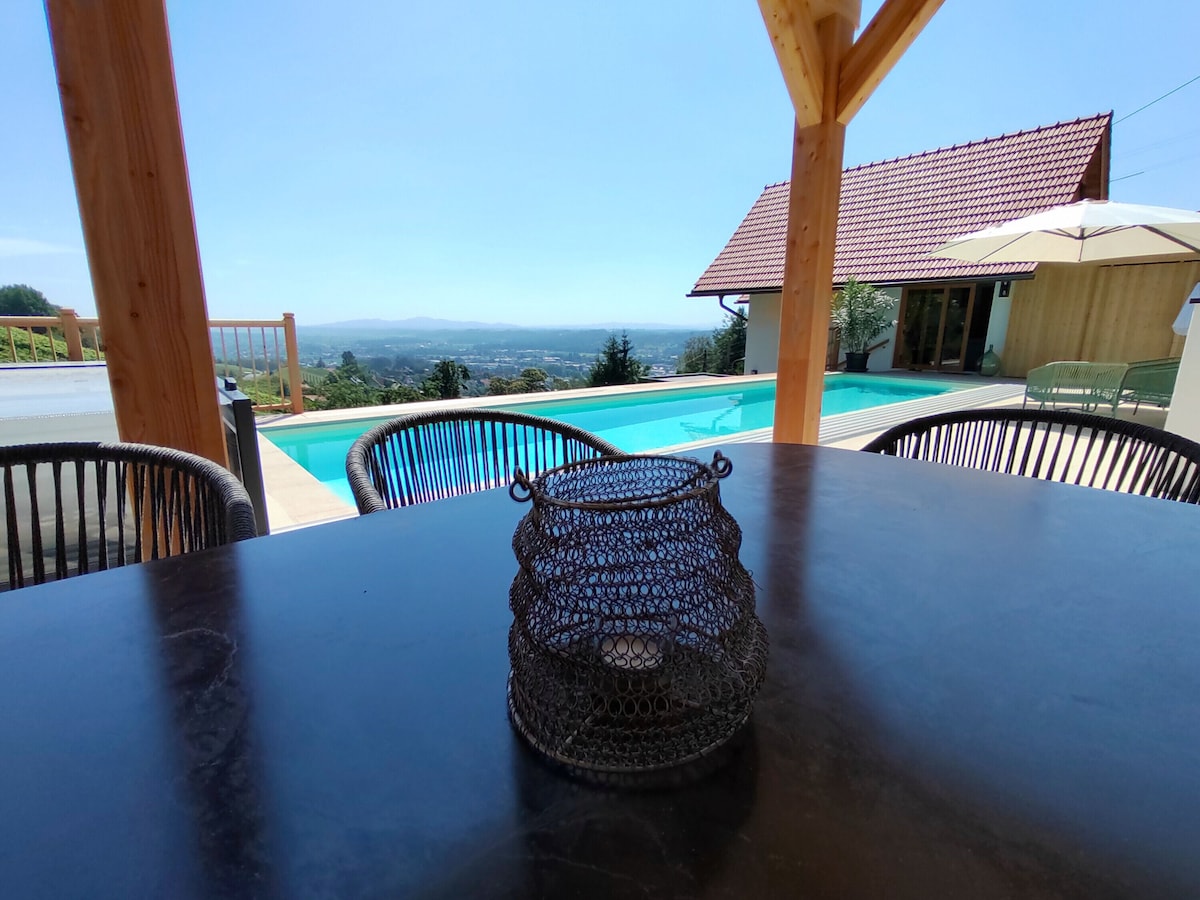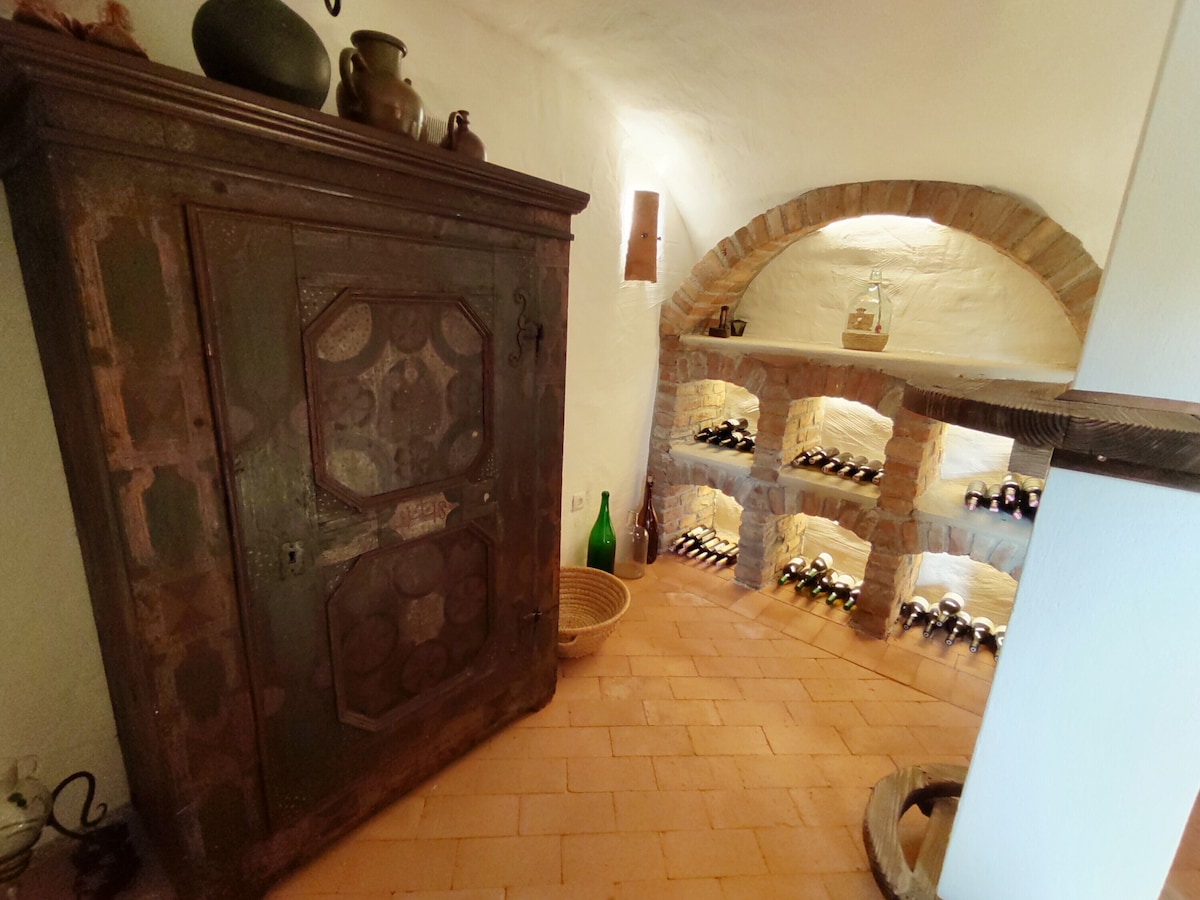 The villa includes a beautiful private outdoor area with a panoramic view of the nearby vineyards, a large pool, an open terrace and a covered terrace.