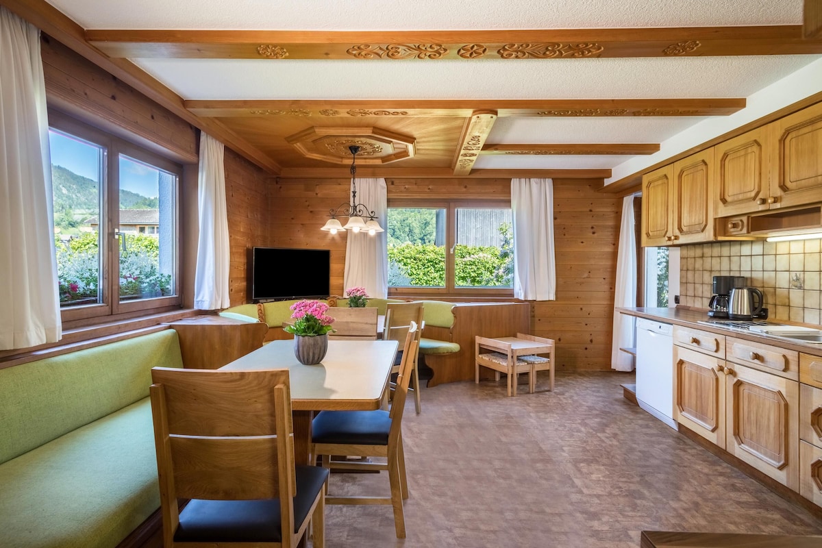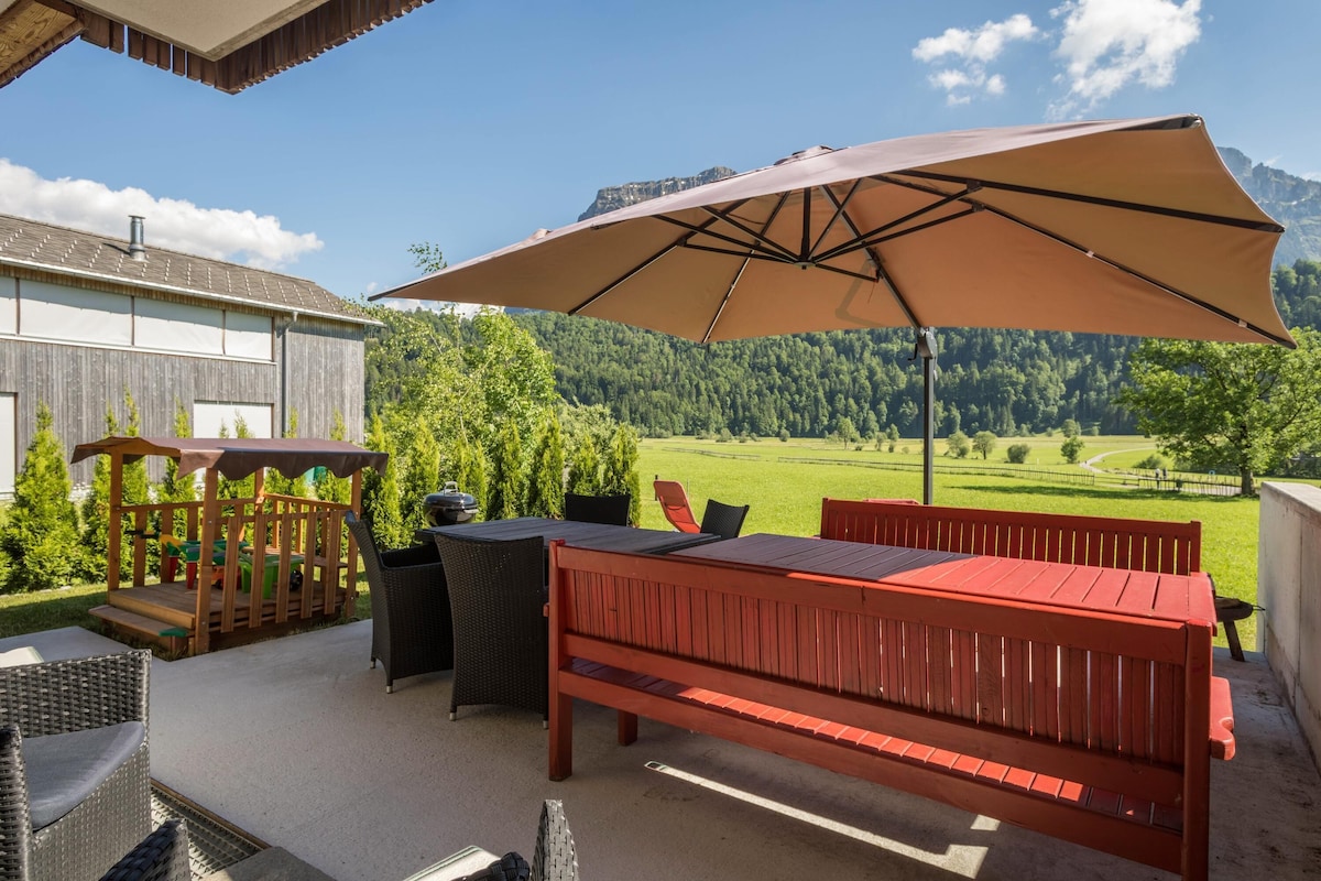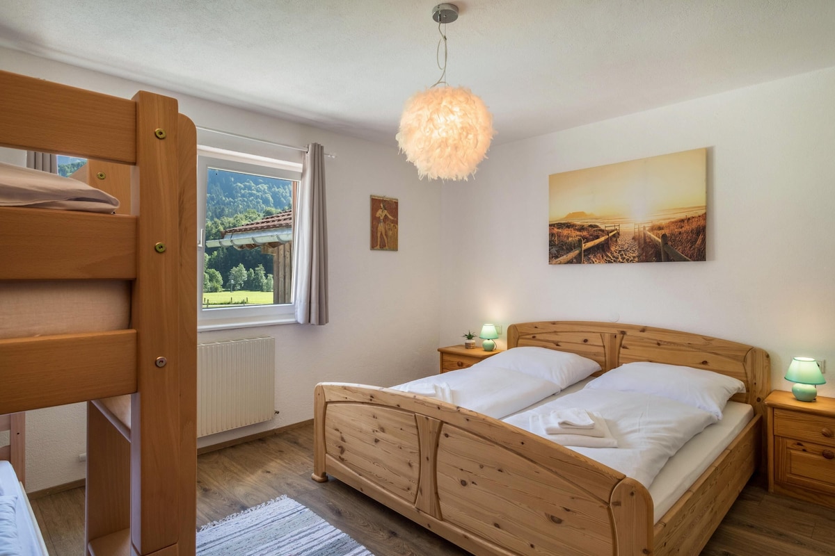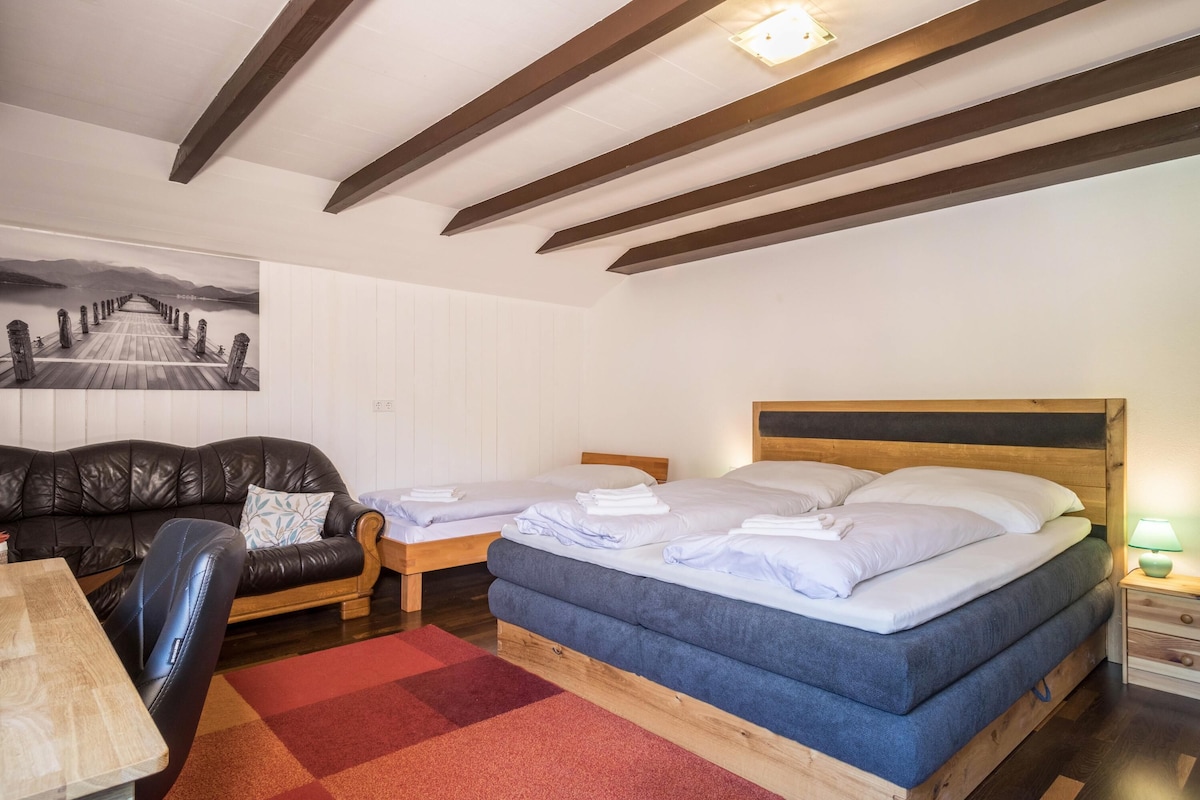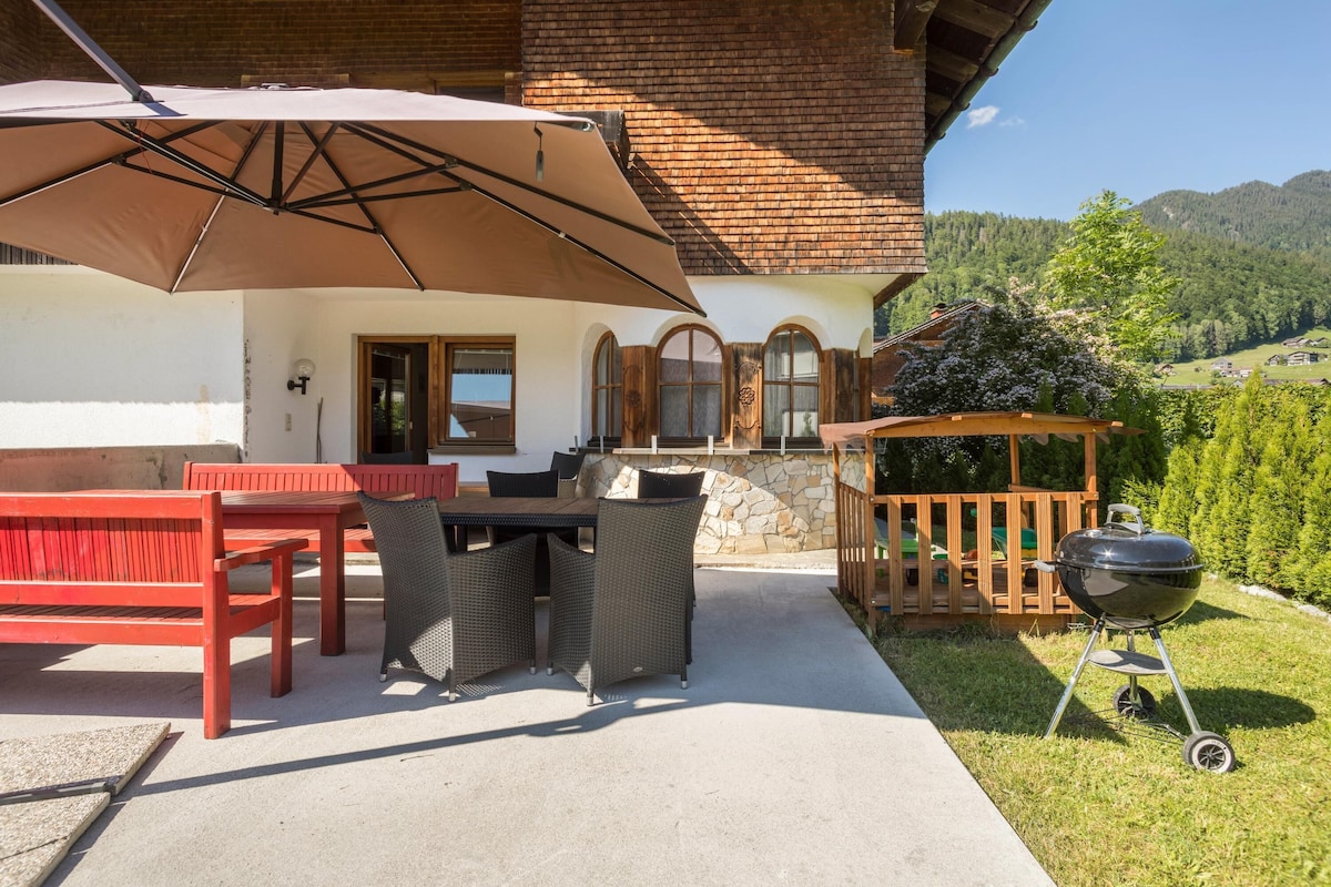 The modern and cozy vacation home Leonardo with a magnificent view of the mountains is located in Bizau, a small village in the mountain region near Bregenz and Lake Constance, and is ideal for a vacation in the Alps with the whole family or with groups of friends. The 200 m² vacation home with wood-burning stove consists of a living room, a very well-equipped kitchen with dishwasher, 4 bedrooms (3 with an extra single bed each and one with a single bed and a bunk bed for 2 people) as well as 2 bathrooms and a guest toilet, thus accommodating 12 people. Amenities also include Wi-Fi, a washing machine, cable TV, a crib and a high chair (both available upon request). Start your day with a coffee on the balcony and enjoy the magnificent direct view of the mountain ridges. The private outdoor area features a lush and well-kept communal garden, as well as an open terrace where you can enjoy delicious meals from the grill in the evenings. In addition, the outdoor location is a paradise for children. Your loved ones can play in the large children’s playground, which has, among other things, a slide, swings and 2 cottages with a connecting bridge. A bus stop is a 4-minute walk away (350 m), a supermarket is 450 m away (5-minute walk), and in Bezau you will find restaurants, stores, a bakery and a pharmacy after a 10-minute drive (5.5 km). From the house you have direct access to a great cross-country ski trail, and several nearby ski lifts can be reached after only 6-12 minutes by car (2-8 km). The charming city of Bregenz on the famous Lake Constance is only 45 minutes by car or 40 km from the house. Within an hour’s drive (45-50 km) you can also visit Liechtenstein and Switzerland.
