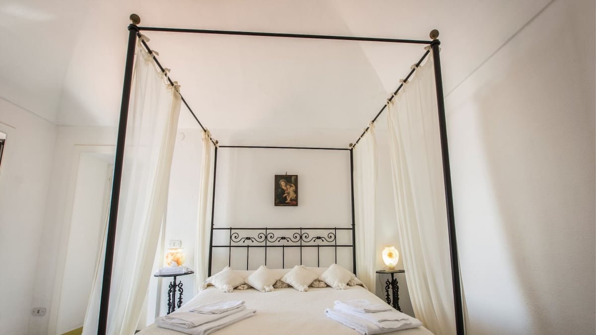– Romantic double bedroom with a hydro massage shower bathroom en suite. The room, furnished with fireplace and poster bed, has an independent outside access opening on a small terrace provided also with a small service room