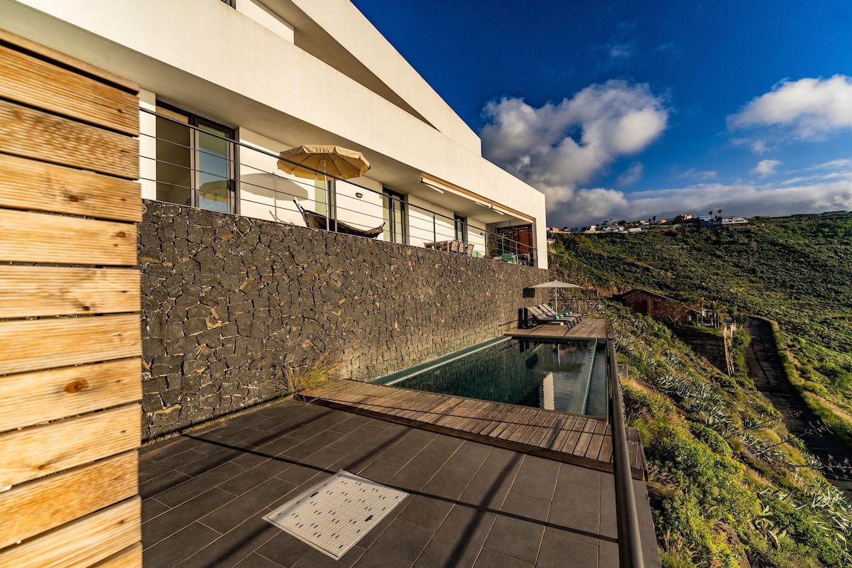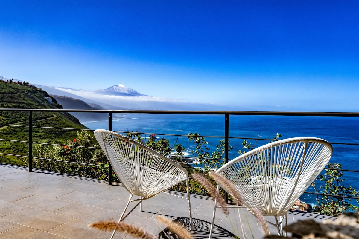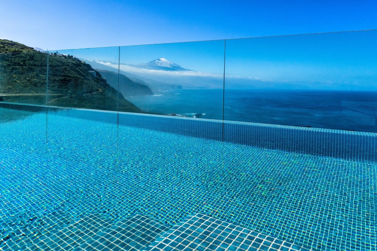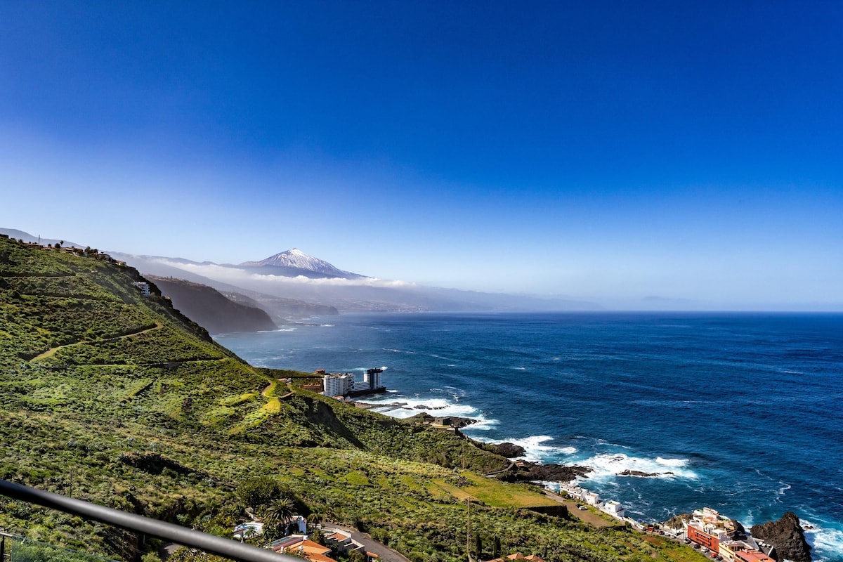 Additional amenities include Wi-Fi (fibre suitable for teleworking), 2 smart TVS and 1 satellite TV and a play area with a billiard table and various toys for children. A crib and a high chair for children are available on request. The house includes several private terraces, which offer you a fantastic view of the sea and the volcano Pico del Teide. One of the terraces is covered, equipped with a cozy sitting area, a barbecue and a large dining table. Here you can enjoy convivial barbecues while admiring the sunset over the sea. Another highlight is the lower terrace, which is equipped with sun loungers and a private infinity pool that is even heated in winter. Walking down the slope, you’ll reach the coast after about 20 minutes, where you’ll find a small seawater swimming pool, a restaurant, a bar and a marina. The nearest supermarket is a 4-minute drive (2.3km) away.