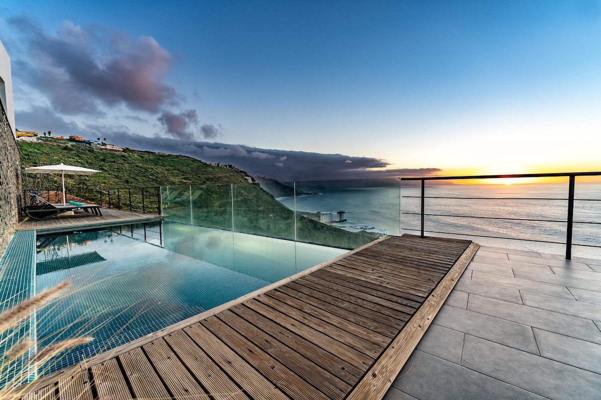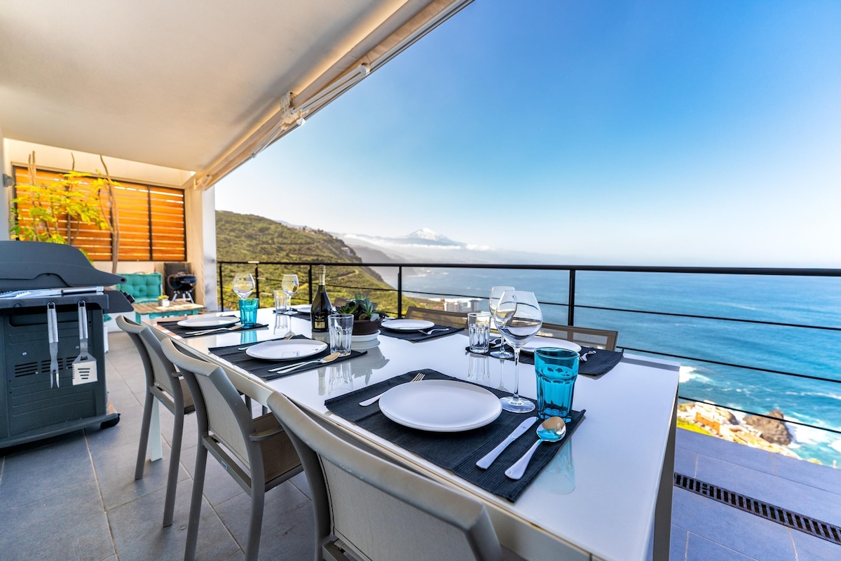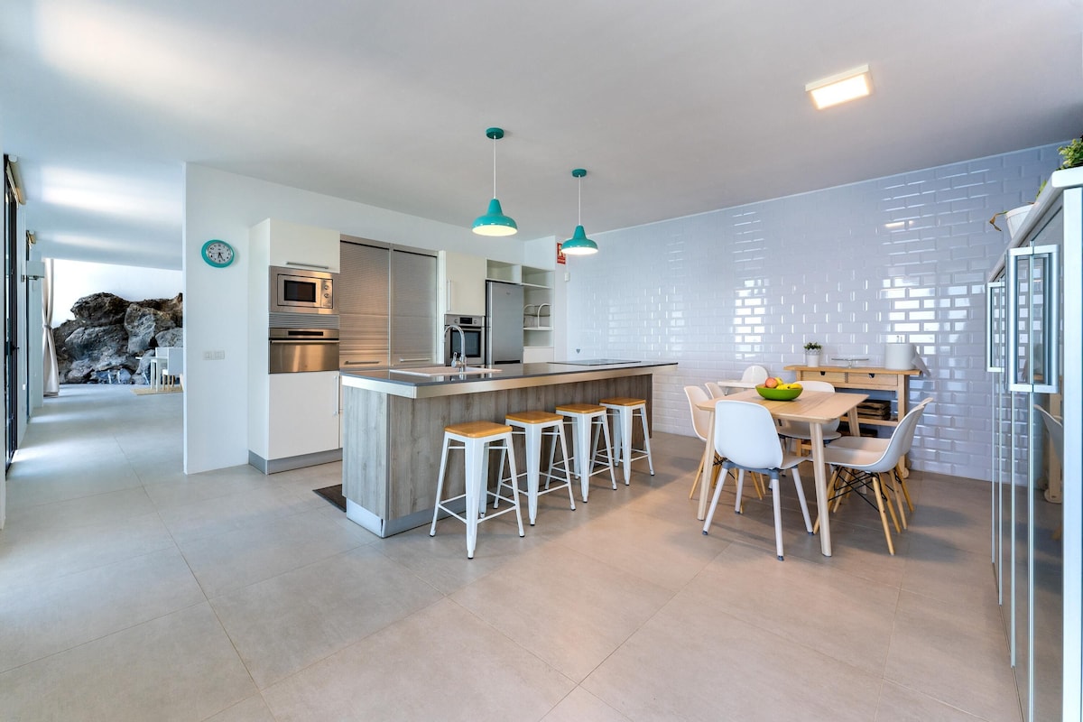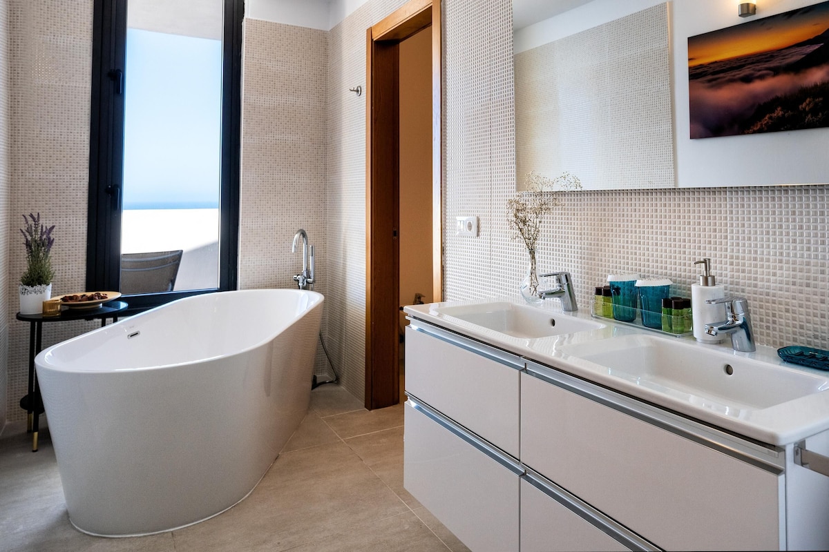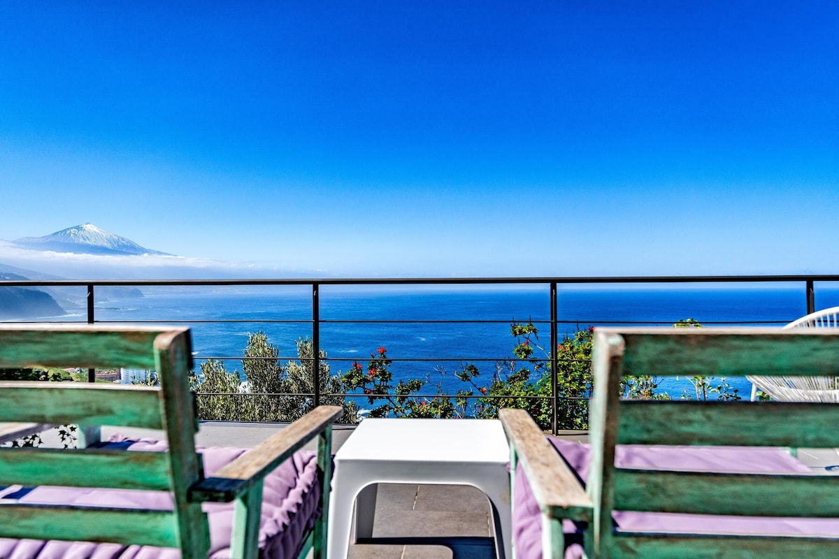 Additional amenities include Wi-Fi (fibre suitable for teleworking), 2 smart TVS and 1 satellite TV and a play area with a billiard table and various toys for children. A crib and a high chair for children are available on request. The house includes several private terraces, which offer you a fantastic view of the sea and the volcano Pico del Teide. One of the terraces is covered, equipped with a cozy sitting area, a barbecue and a large dining table. Here you can enjoy convivial barbecues while admiring the sunset over the sea. Another highlight is the lower terrace, which is equipped with sun loungers and a private infinity pool that is even heated in winter. Walking down the slope, you’ll reach the coast after about 20 minutes, where you’ll find a small seawater swimming pool, a restaurant, a bar and a marina. The nearest supermarket is a 4-minute drive (2.3km) away.