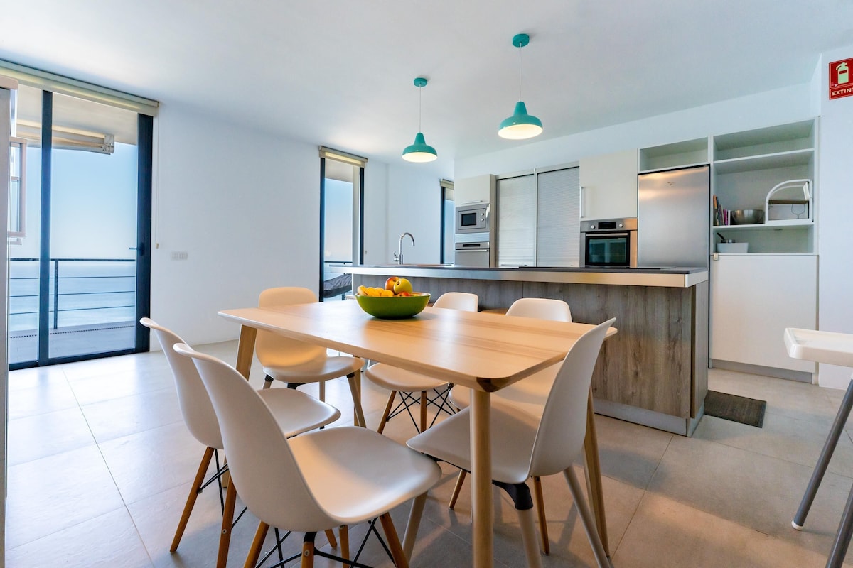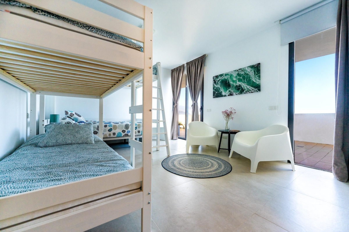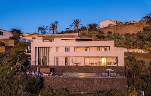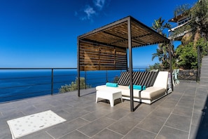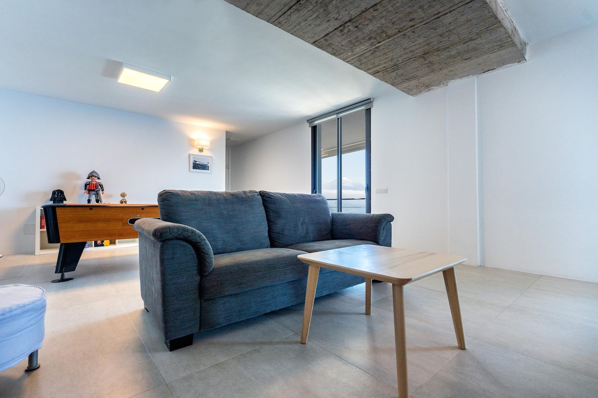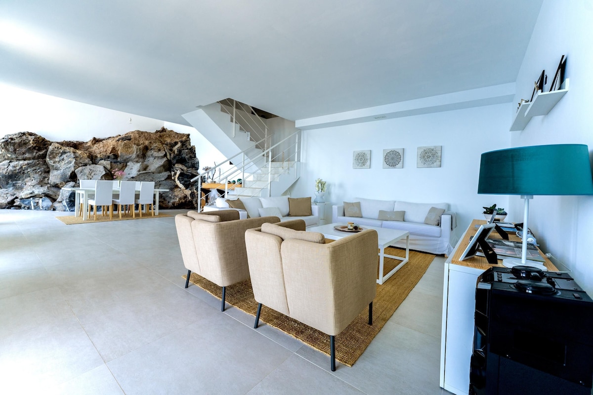 Additional amenities include Wi-Fi (fibre suitable for teleworking), 2 smart TVS and 1 satellite TV and a play area with a billiard table and various toys for children. A crib and a high chair for children are available on request. The house includes several private terraces, which offer you a fantastic view of the sea and the volcano Pico del Teide. One of the terraces is covered, equipped with a cozy sitting area, a barbecue and a large dining table. Here you can enjoy convivial barbecues while admiring the sunset over the sea. Another highlight is the lower terrace, which is equipped with sun loungers and a private infinity pool that is even heated in winter. Walking down the slope, you’ll reach the coast after about 20 minutes, where you’ll find a small seawater swimming pool, a restaurant, a bar and a marina. The nearest supermarket is a 4-minute drive (2.3km) away.