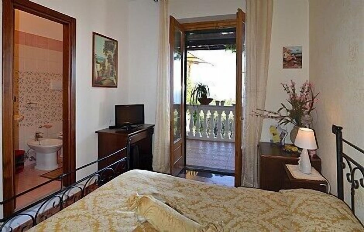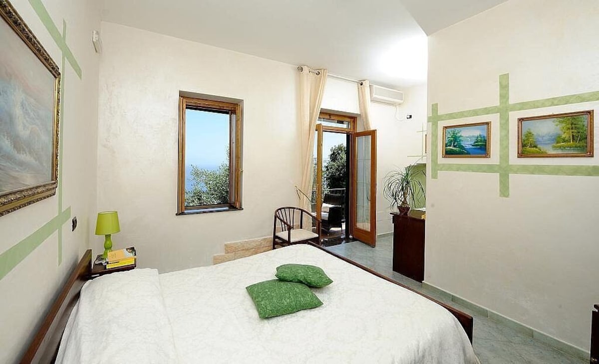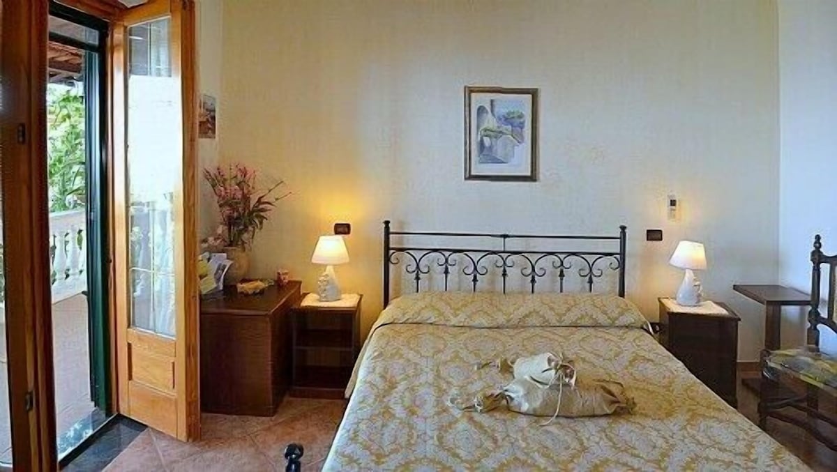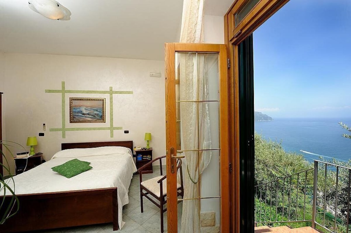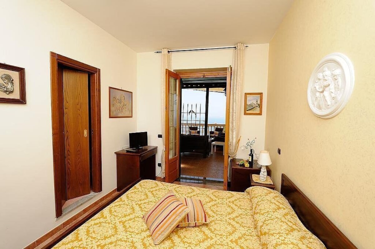 You will be able to enter the second bedroom from the corridor. The bedroom has a matrimonial bed (160 cm/63 inches, wider than a queen-size bed). In this room you will find a small television (local channels). From the bedroom you will be able to enter the second terrace with a view of the sea and of the coast of Amalfi through a French door. The bedroom is equipped with an air conditioning/heating unit, and you will also find a mini refrigerator. This bedroom has an en-suite bathroom, equipped with a washbasin, a toilet, a hydromassage shower and a hairdryer.