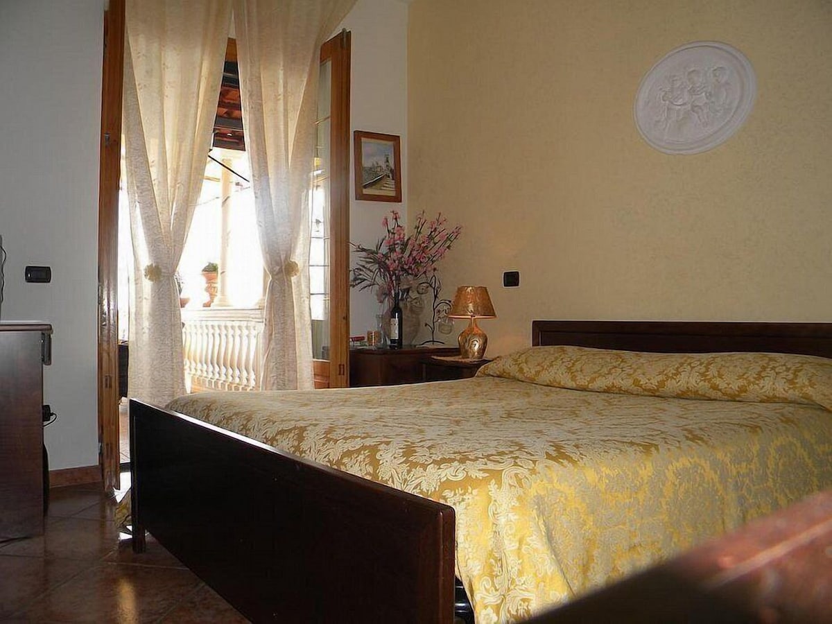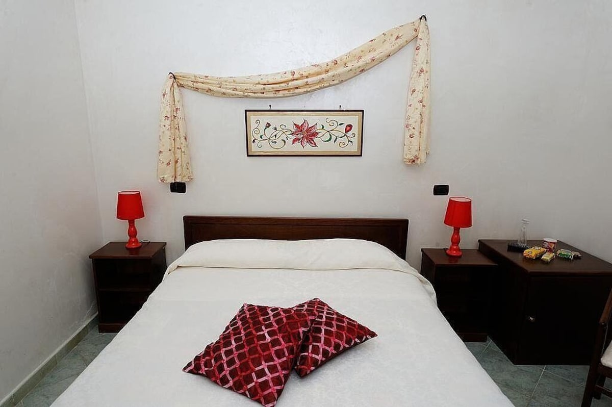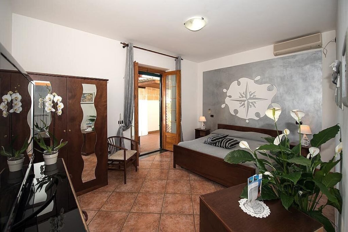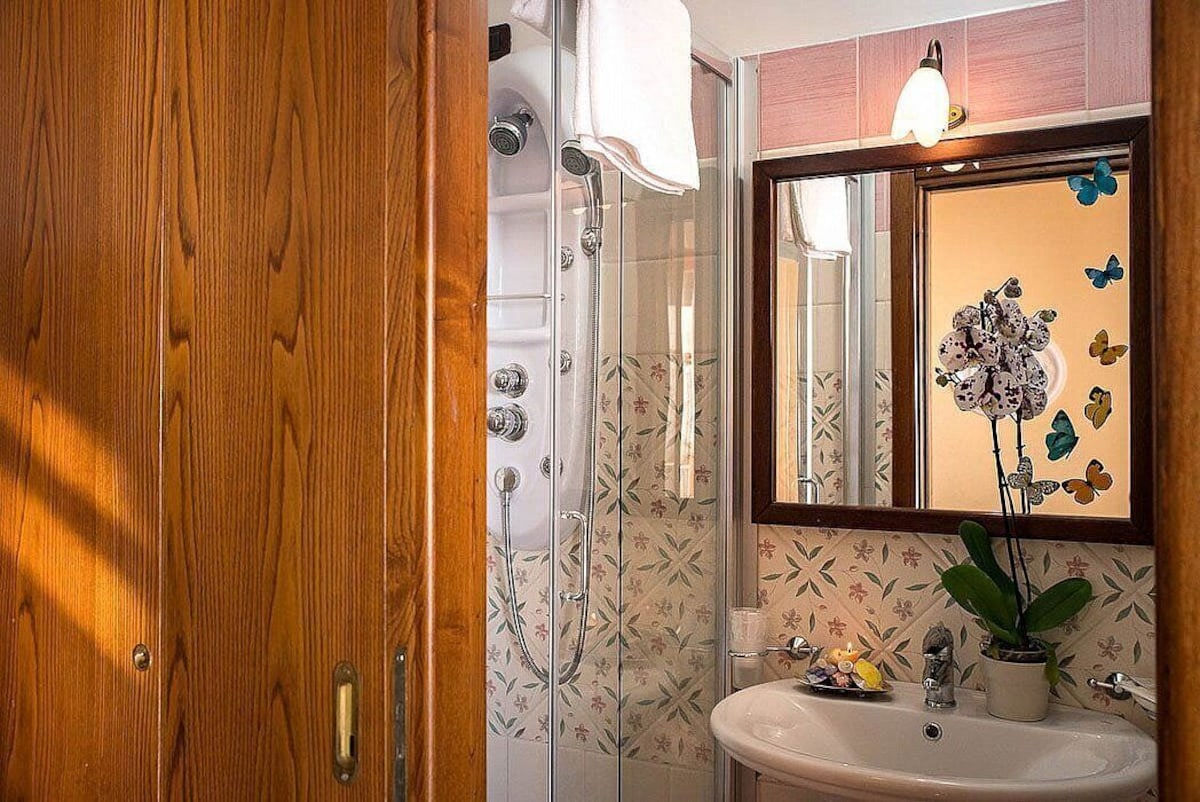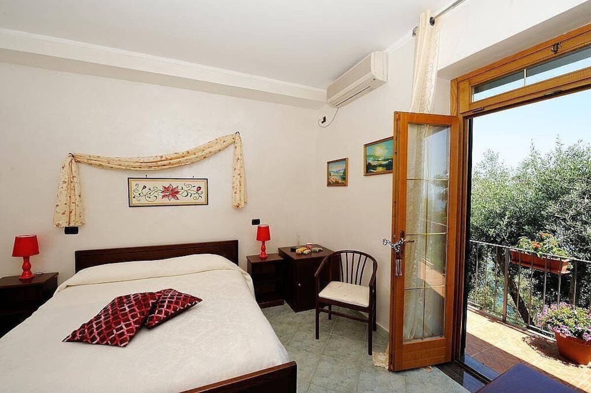 You will be able to enter the second bedroom from the corridor. The bedroom has a matrimonial bed (160 cm/63 inches, wider than a queen-size bed). In this room you will find a small television (local channels). From the bedroom you will be able to enter the second terrace with a view of the sea and of the coast of Amalfi through a French door. The bedroom is equipped with an air conditioning/heating unit, and you will also find a mini refrigerator. This bedroom has an en-suite bathroom, equipped with a washbasin, a toilet, a hydromassage shower and a hairdryer.