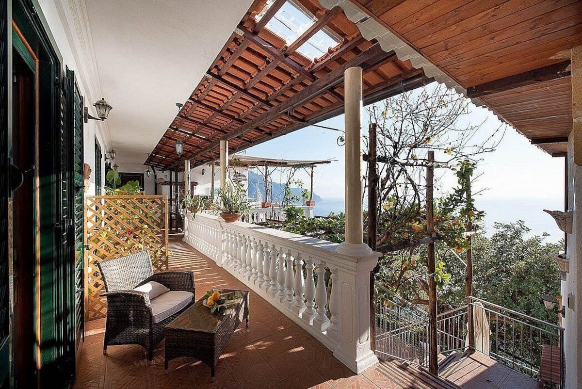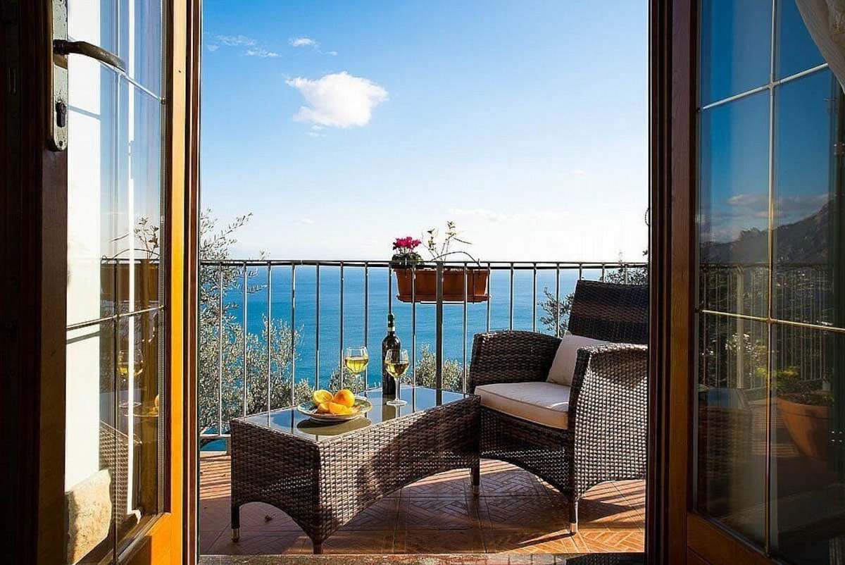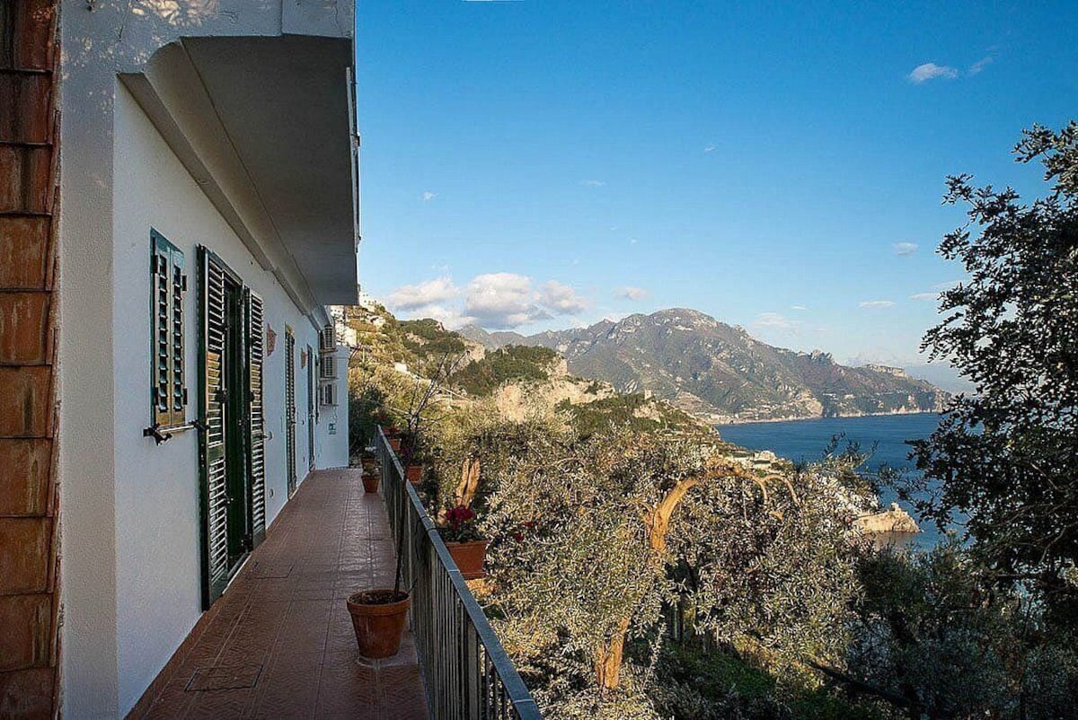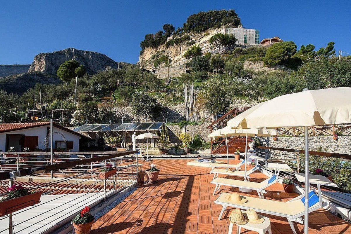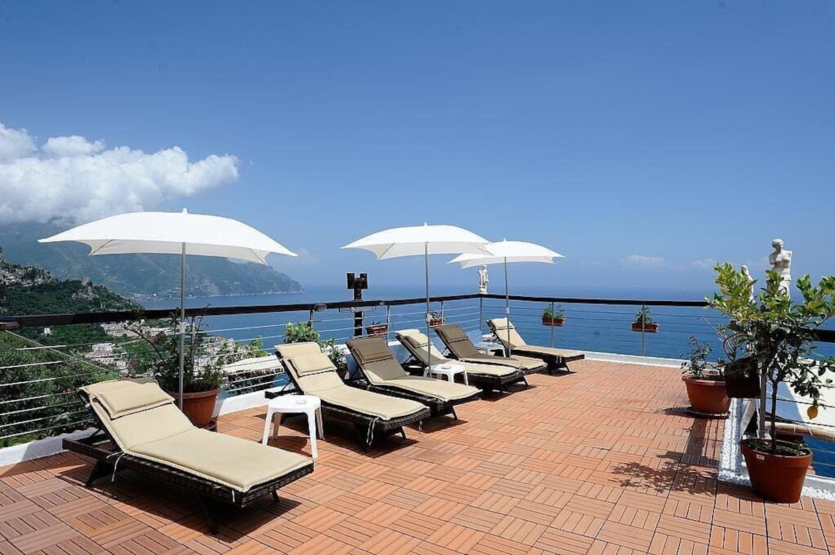 You will be able to enter the third bedroom from the corridor. The bedroom has a matrimonial bed (160 cm/63 inches, wider than a queen-size bed). In this room you will find a flat-screen television (local channels). From the bedroom you will be able to enter the first terrace with a view of the sea and of the coast of Amalfi through a French door. The bedroom is equipped with an air conditioning/heating unit, and you will also find a mini refrigerator. This bedroom has an en-suite bathroom, equipped with a washbasin, a toilet, a hydromassage shower and a hairdryer.