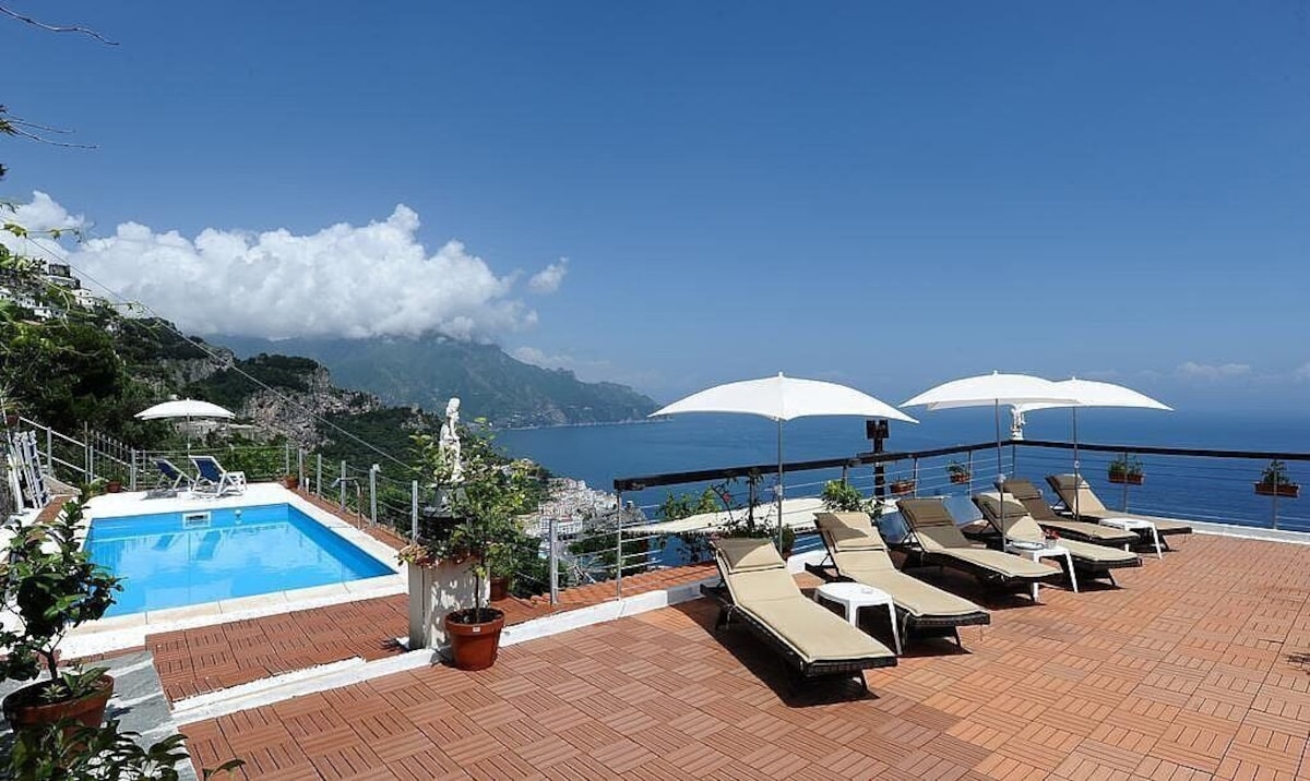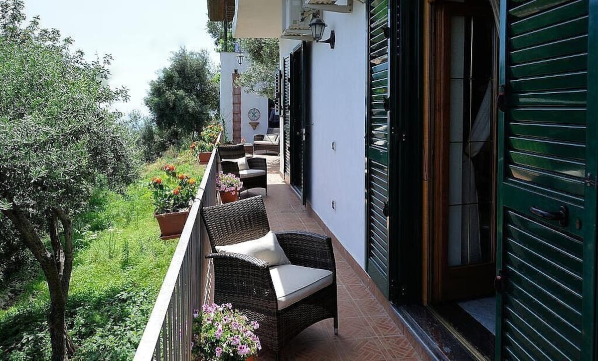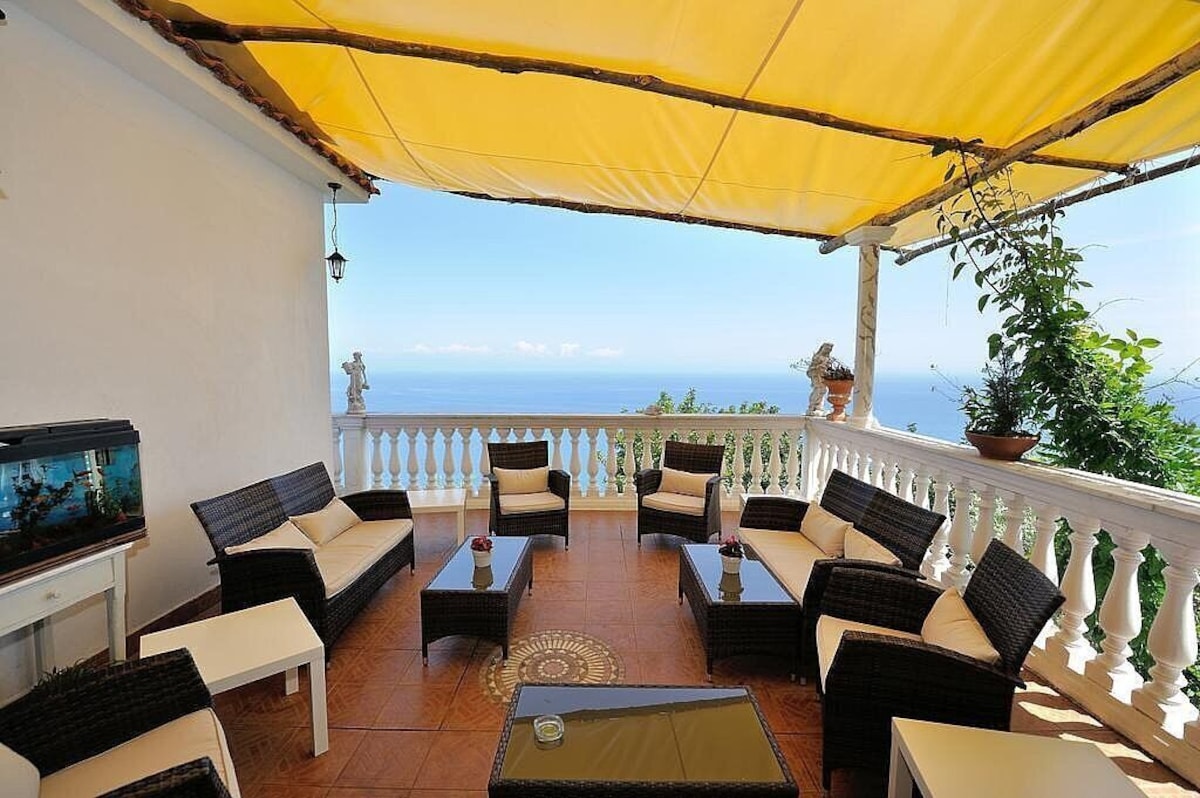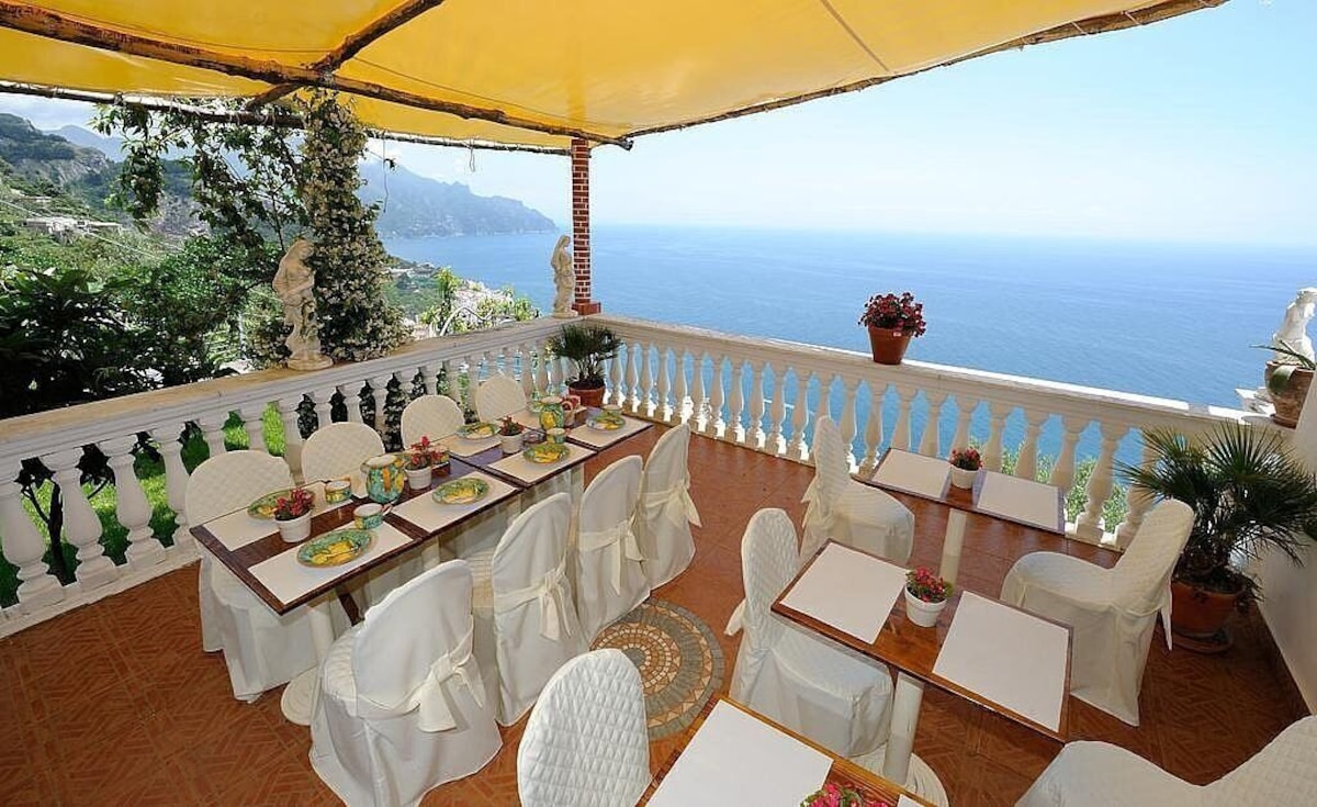 You will be able to enter the third bedroom from the corridor. The bedroom has a matrimonial bed (160 cm/63 inches, wider than a queen-size bed). In this room you will find a flat-screen television (local channels). From the bedroom you will be able to enter the first terrace with a view of the sea and of the coast of Amalfi through a French door. The bedroom is equipped with an air conditioning/heating unit, and you will also find a mini refrigerator. This bedroom has an en-suite bathroom, equipped with a washbasin, a toilet, a hydromassage shower and a hairdryer.
