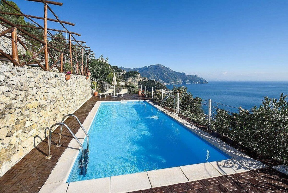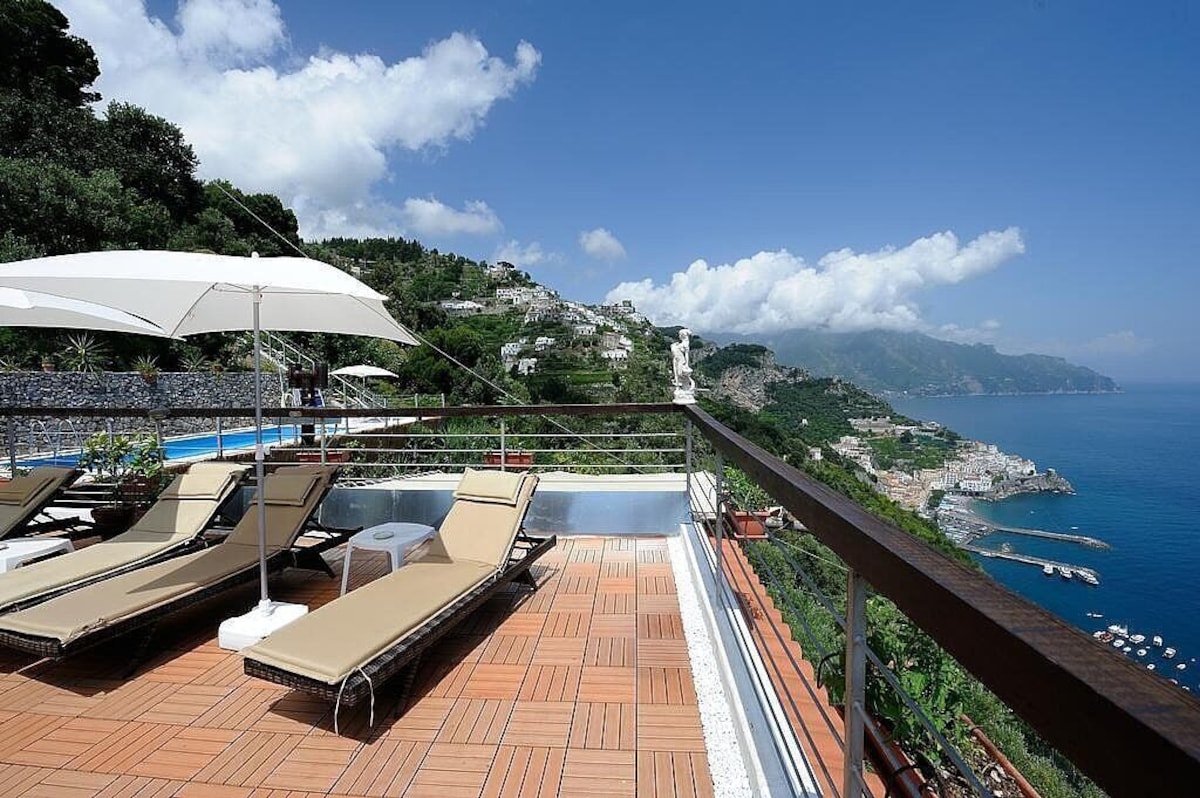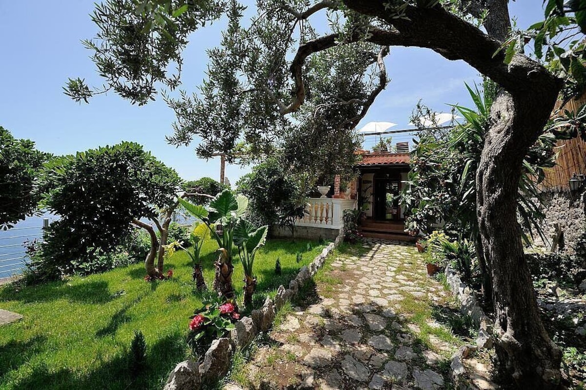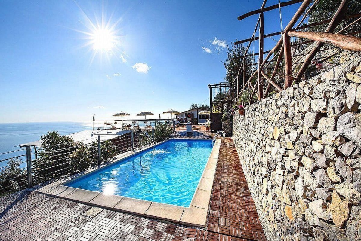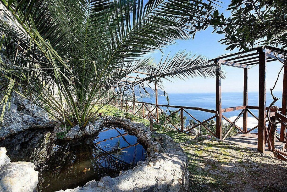 You will be able to enter the third bedroom from the corridor. The bedroom has a matrimonial bed (160 cm/63 inches, wider than a queen-size bed). In this room you will find a flat-screen television (local channels). From the bedroom you will be able to enter the first terrace with a view of the sea and of the coast of Amalfi through a French door. The bedroom is equipped with an air conditioning/heating unit, and you will also find a mini refrigerator. This bedroom has an en-suite bathroom, equipped with a washbasin, a toilet, a hydromassage shower and a hairdryer.