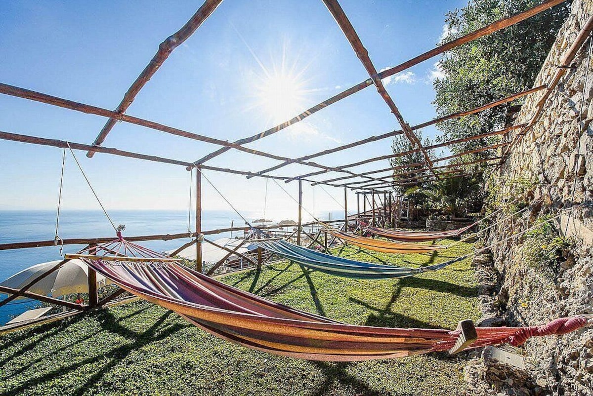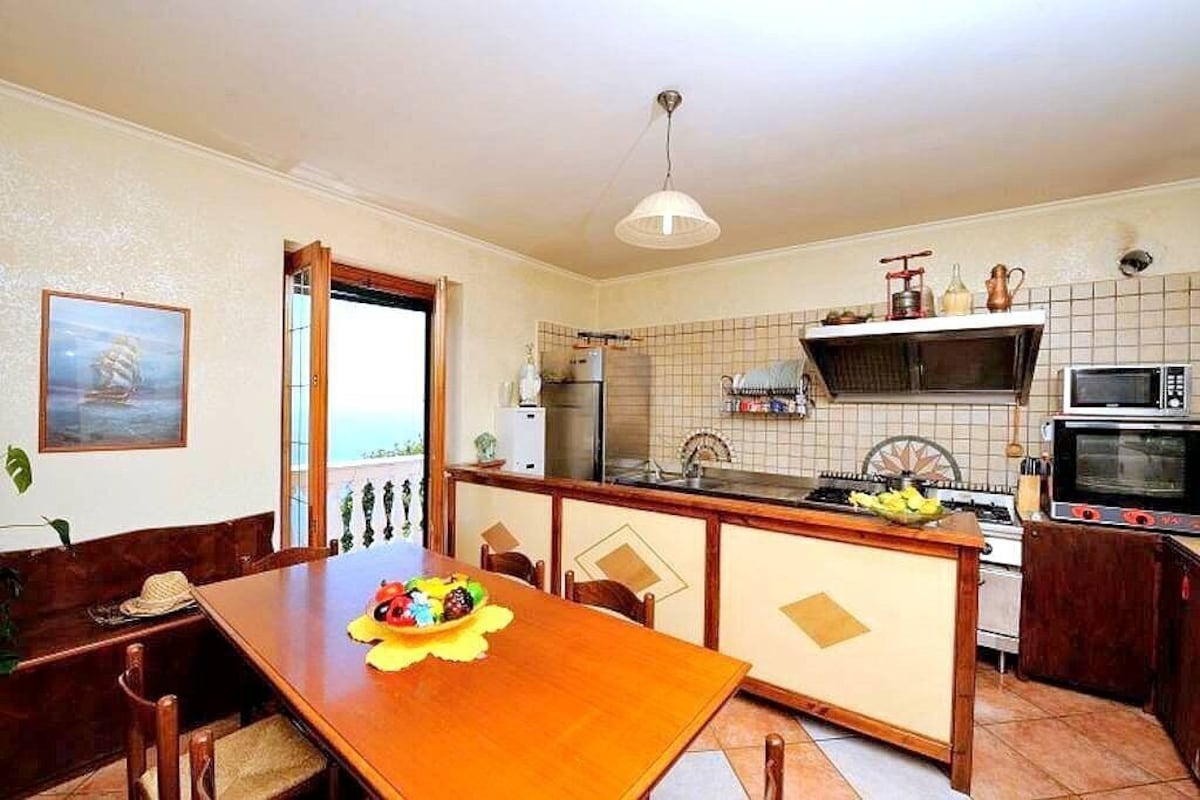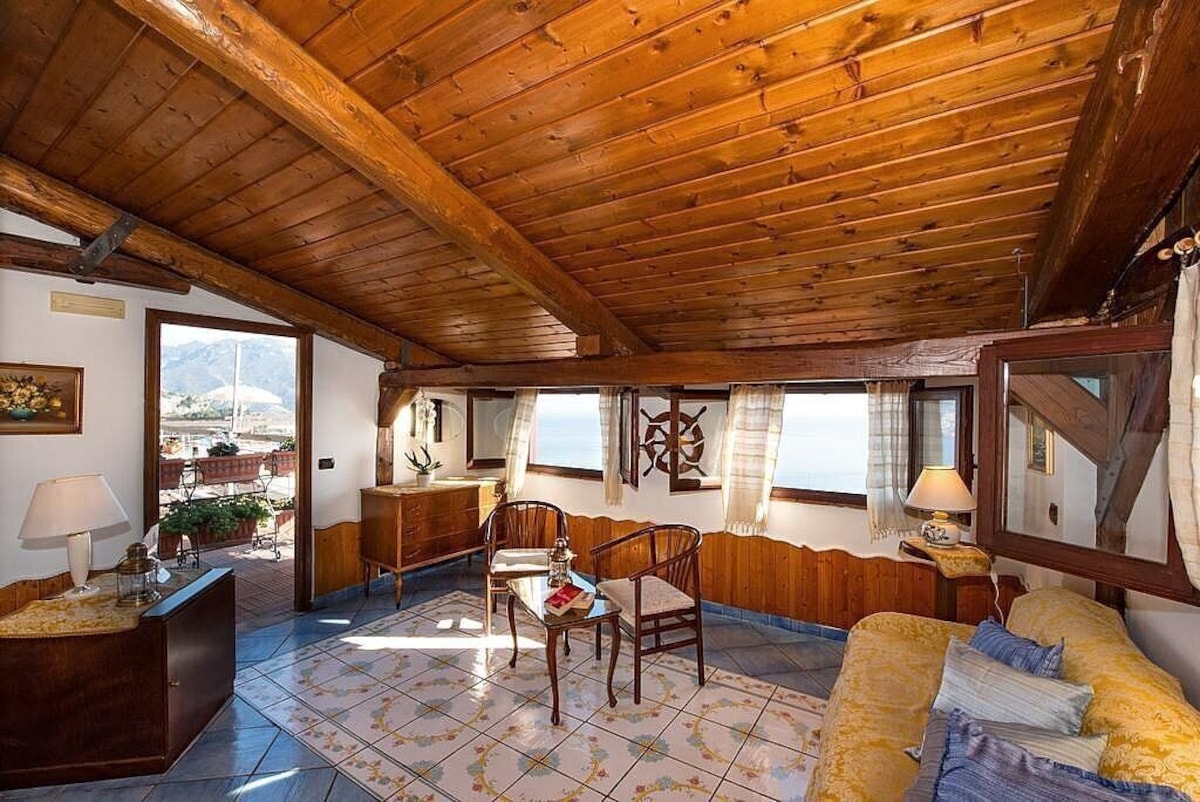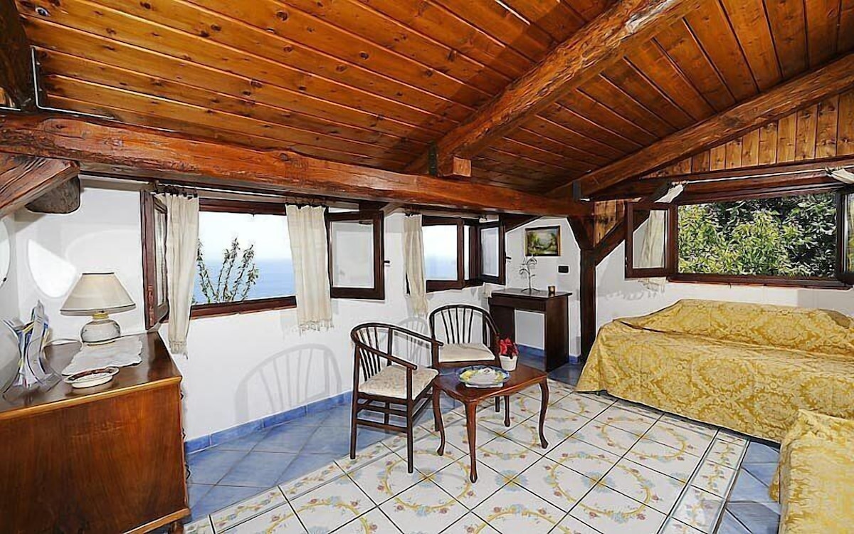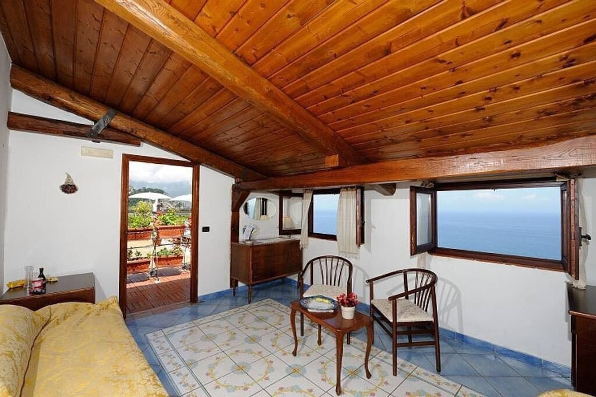 The second living room is paved with tiles with handmade decoration, in the characteristic style of the Amalfi Coast. The ceiling is sloped and has characteristic exposed wood beams. The furnishings are warm and welcoming. The furnishings include two single divan beds. The room has three windows with a view of the sea and of the coastline. It is equipped with an air conditioning/heating unit.