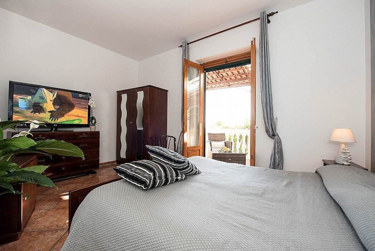 You will be able to enter the first bedroom from the corridor. The bedroom has a matrimonial bed (160 cm/63 inches, wider than a queen-size bed) and a single bed (80 cm/32 inches). In this room you will find a large flat-screen television (local channels). From the bedroom you will be able to enter the second terrace with a view of the sea and of the coast of Amalfi through a French door. The bedroom is equipped with an air conditioning/heating unit. This bedroom has an en-suite bathroom, equipped with a washbasin, a toilet, a jacuzzi bathtub and a hairdryer.