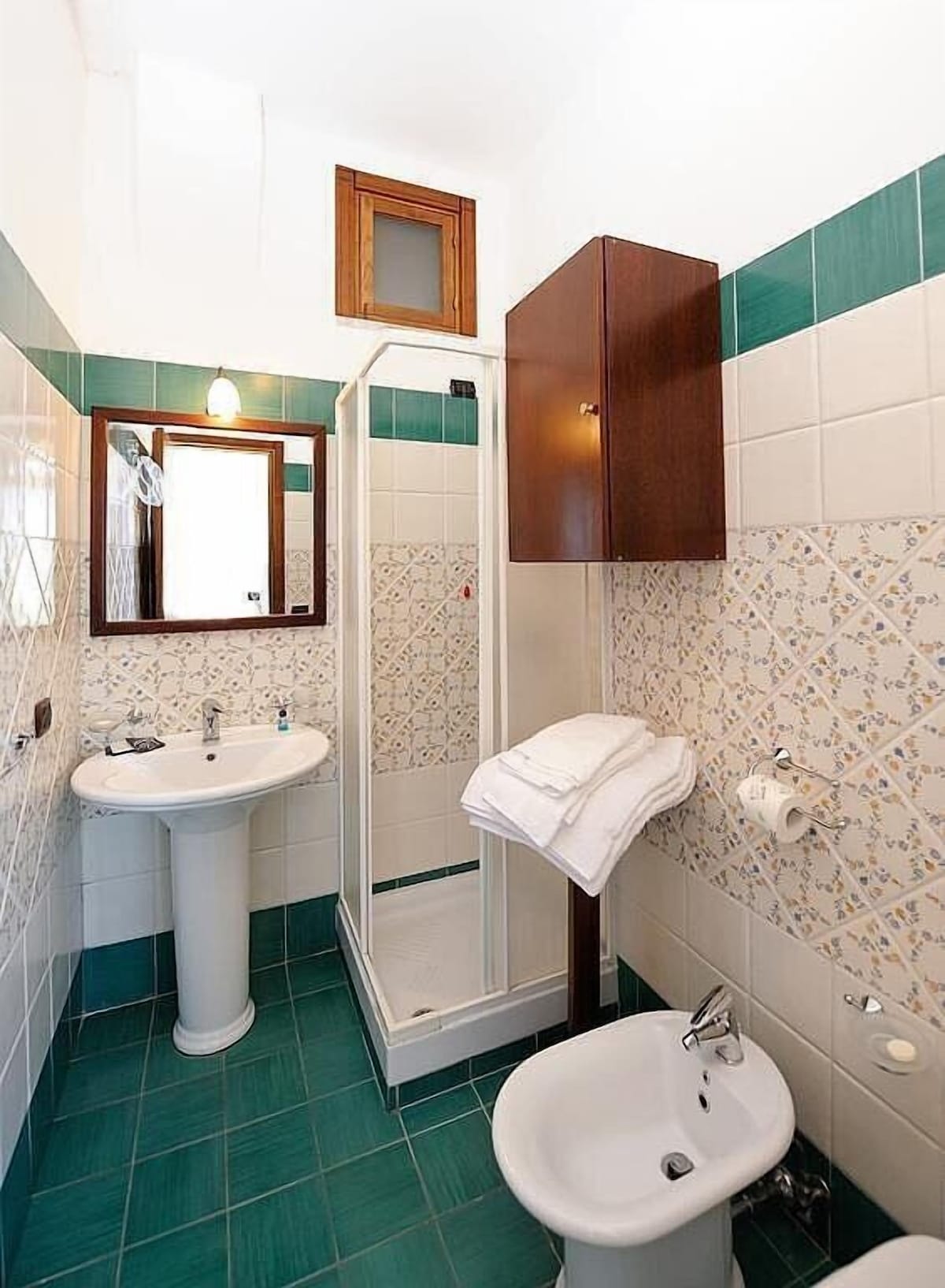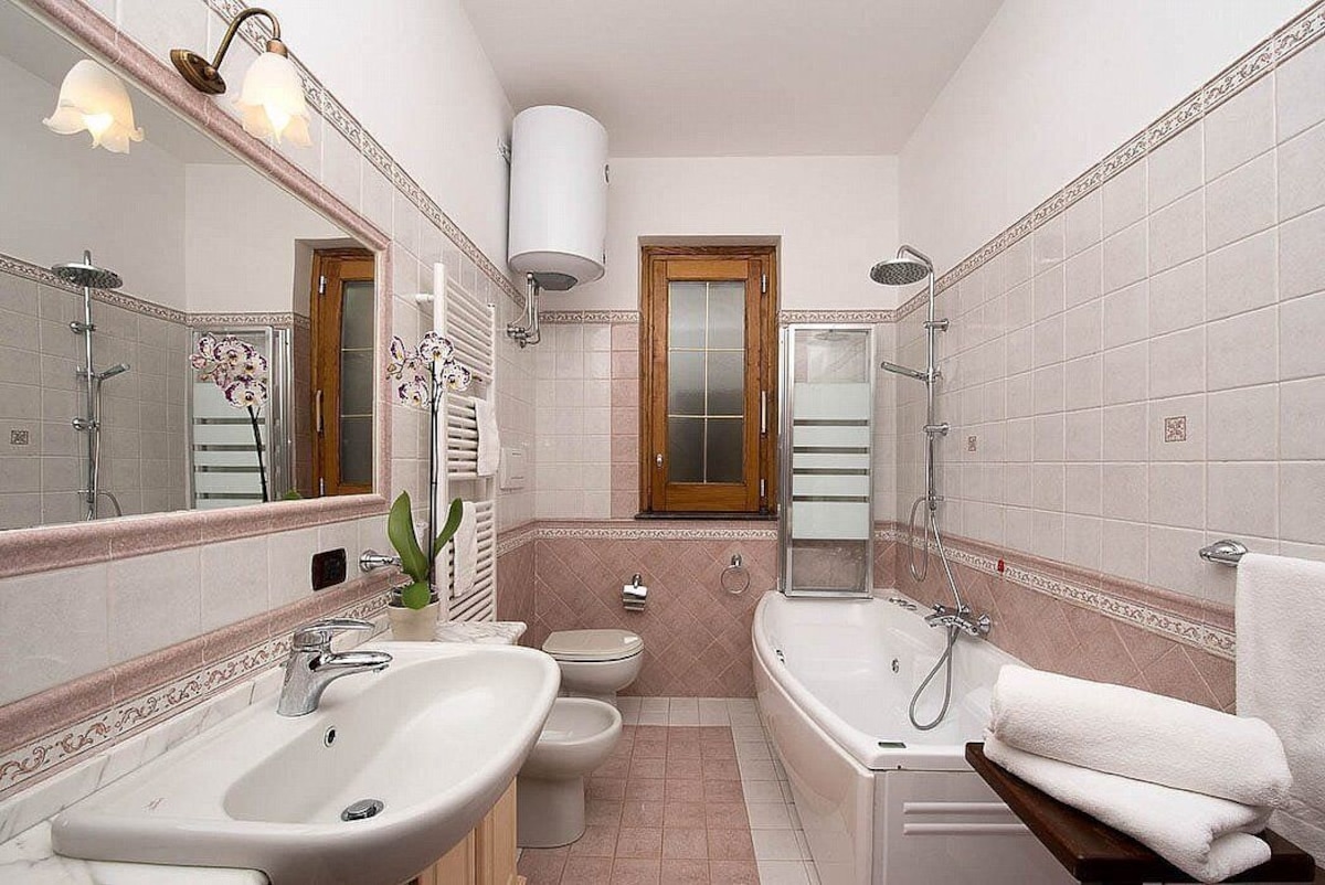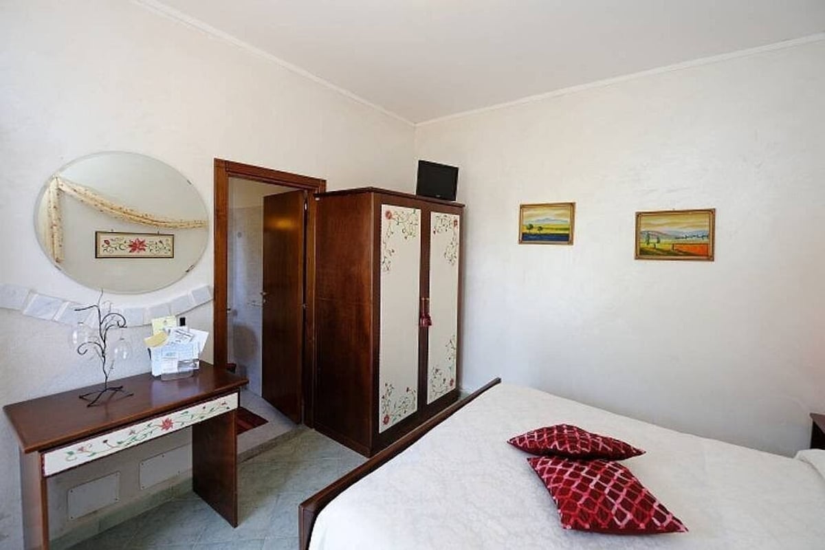 You will be able to enter the sixth bedroom from the terrace through a French door. The bedroom has a matrimonial bed (160 cm/63 inches, wider than a queen-size bed) and a single bed (80 cm/32 inches). In this room you will find a flat-screen television (local channels). The bedroom is equipped with an air conditioning/heating unit, and you will also find a mini refrigerator. This bedroom has an en-suite bathroom, equipped with a washbasin, a toilet, a jacuzzi bathtub and a hairdryer.