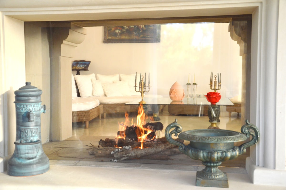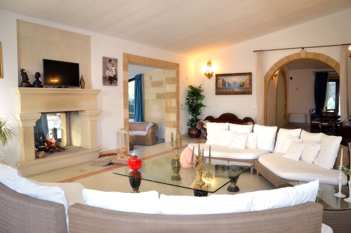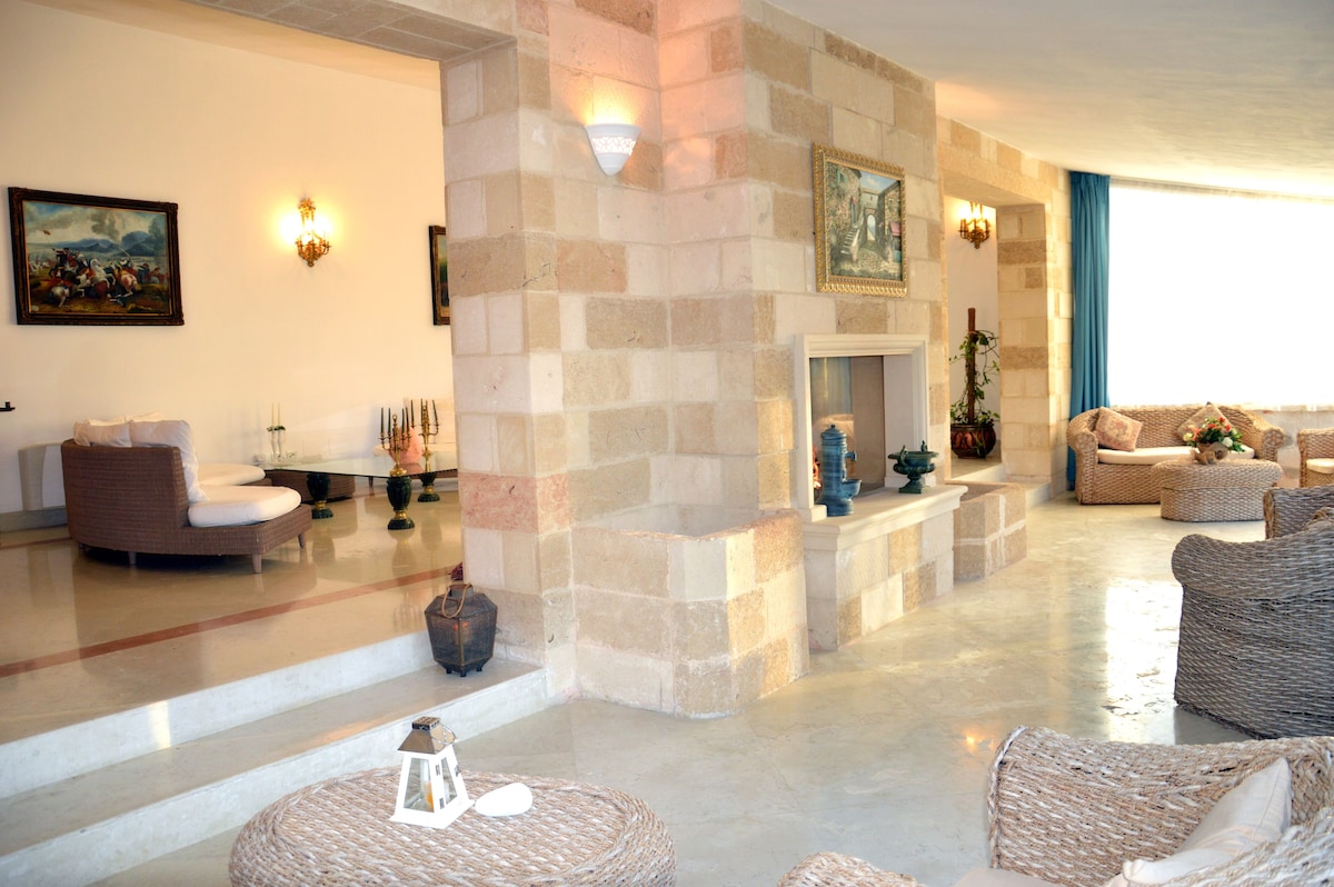 On the ground floor, the elegant entrance leads to a large and refined living area with a double-sided fireplace that ideally separates the TV area and reading or relaxation area, characterized by a large window overlooking the surrounding olive trees. Also on the ground floor there is an equipped kitchen.
