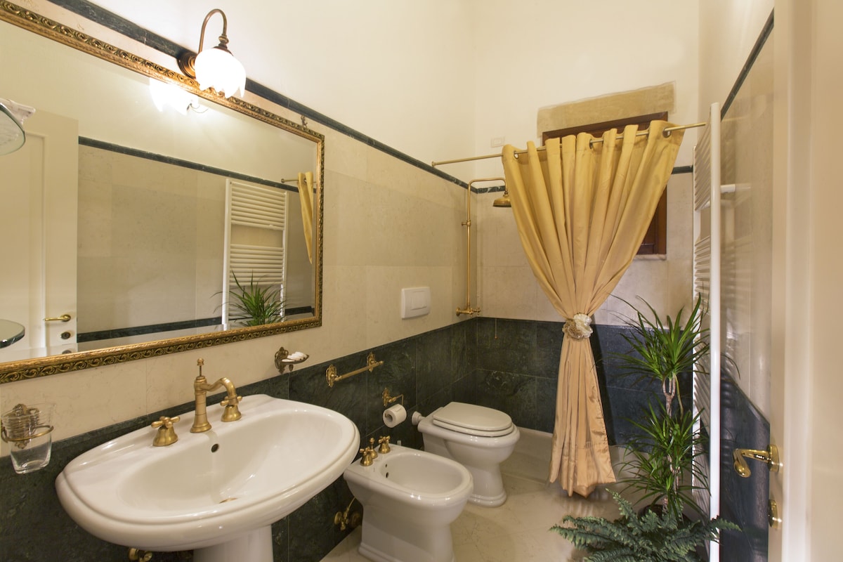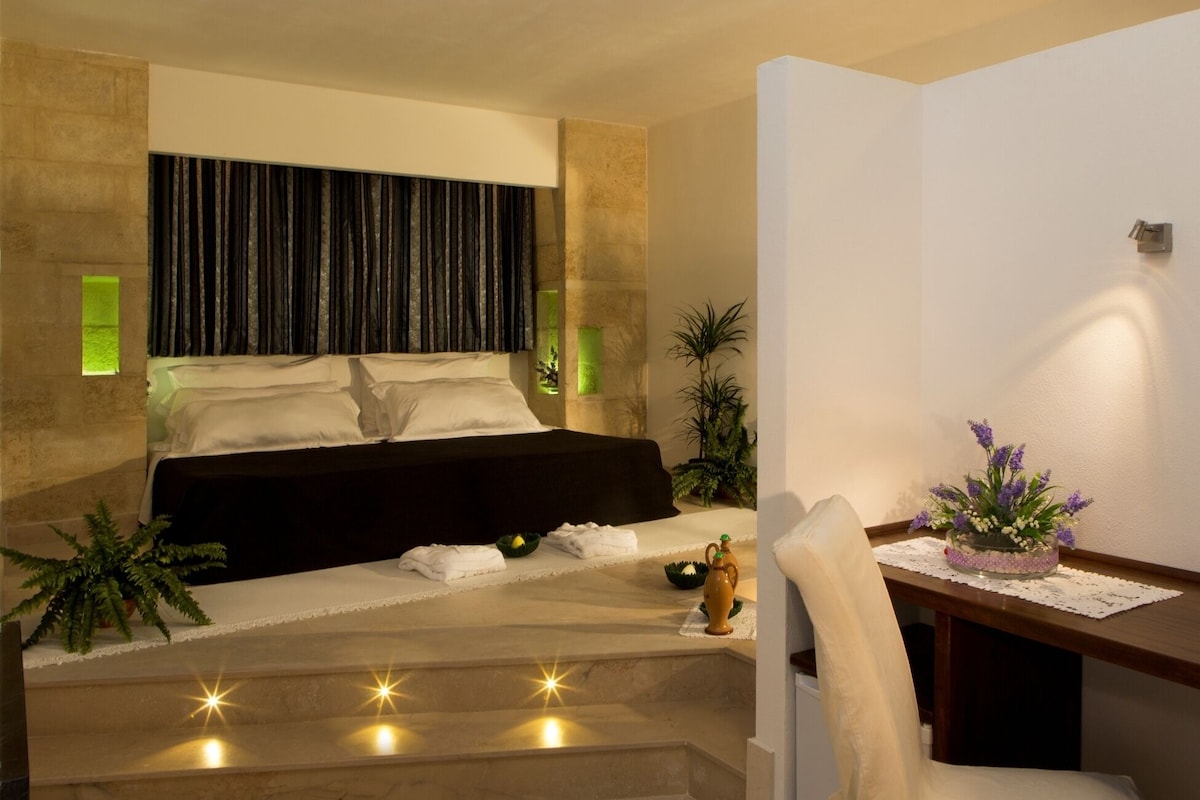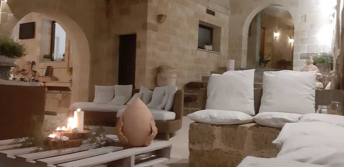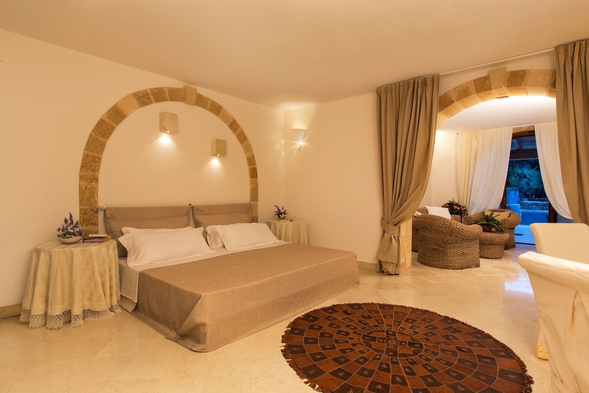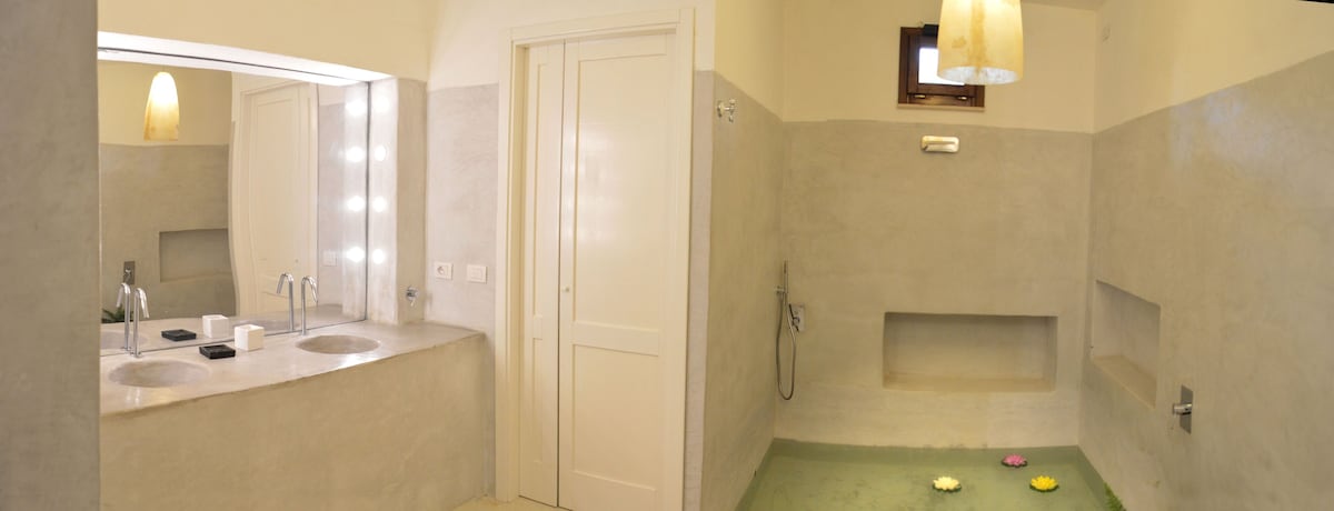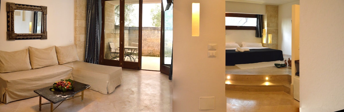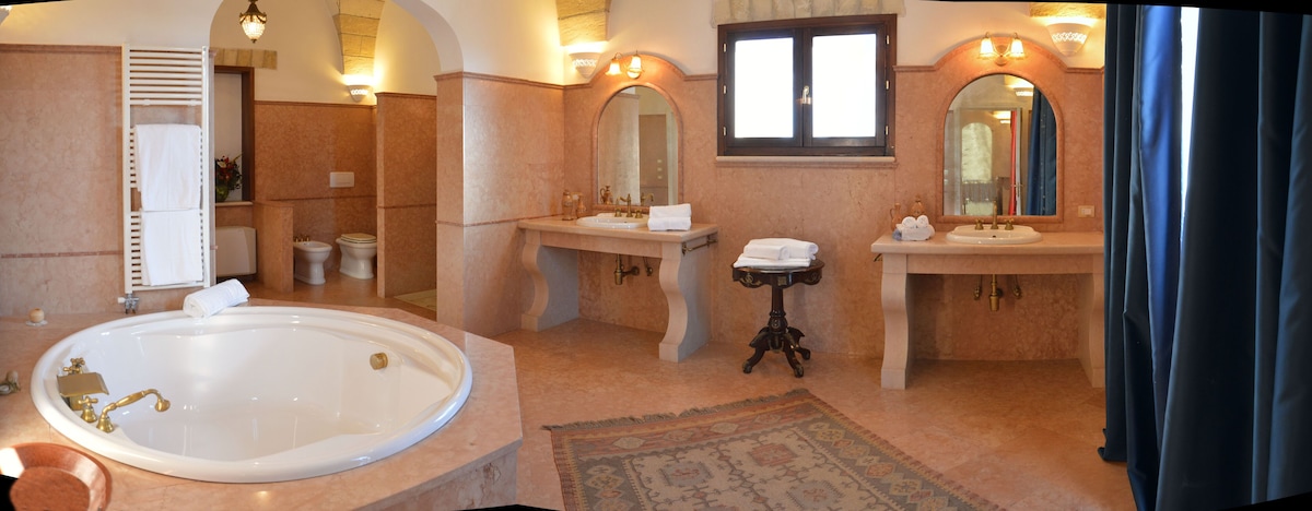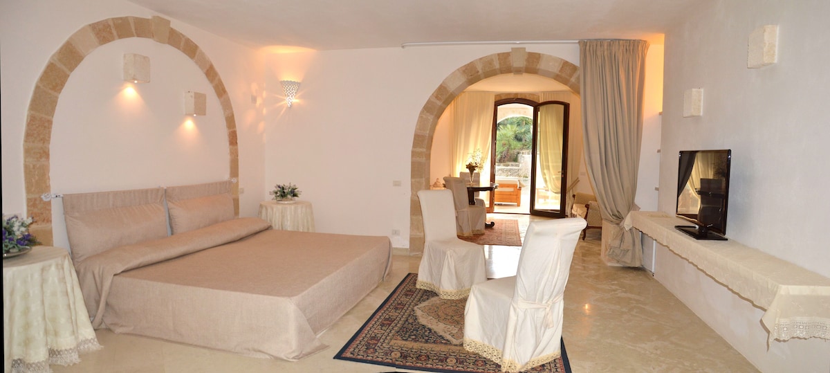 The first suite has an area of ​​about 80 square meters, it is a large loft with a large living room furnished with seating areas, large bedroom with king size bed and a bath room very spacious, in shades of white and pearl gray, with shower and bathtub for two people to line the floor. The tones of the suites are very natural: white, pale yellow, hazel, ivory natural stone colors typical of our land, creating a basic yet refined and delicate.
