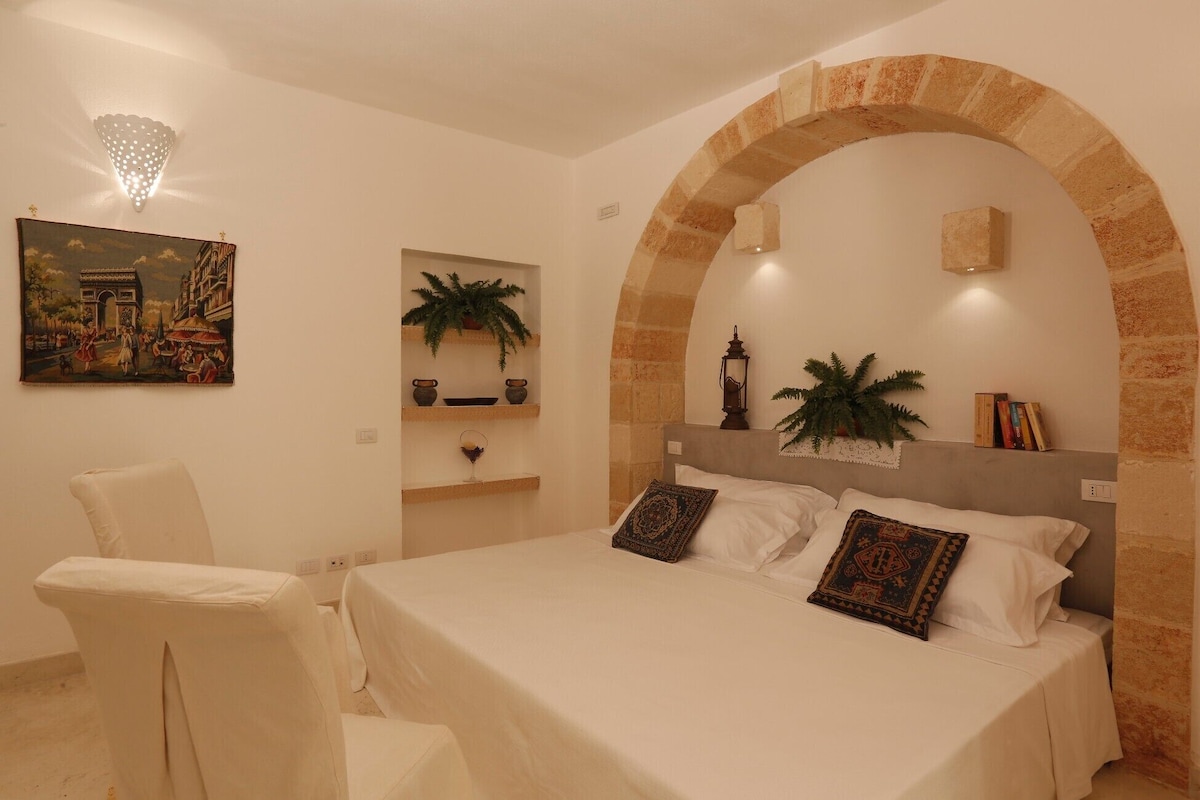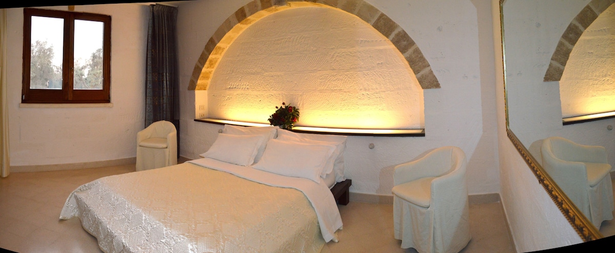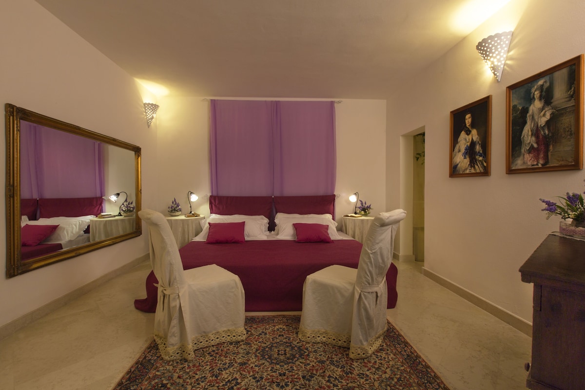 Still inside the Masseria we find the second superior room, which located at the swimming pool, overlooking the green garden. It has an area of ​​about 55 square meters, simple and elegant, with a king size bed, private bathroom with shower and large veranda exclusive, equipped with sofas. The tones of the room are fuchsia and cream, creating a ‘refined and elegant.