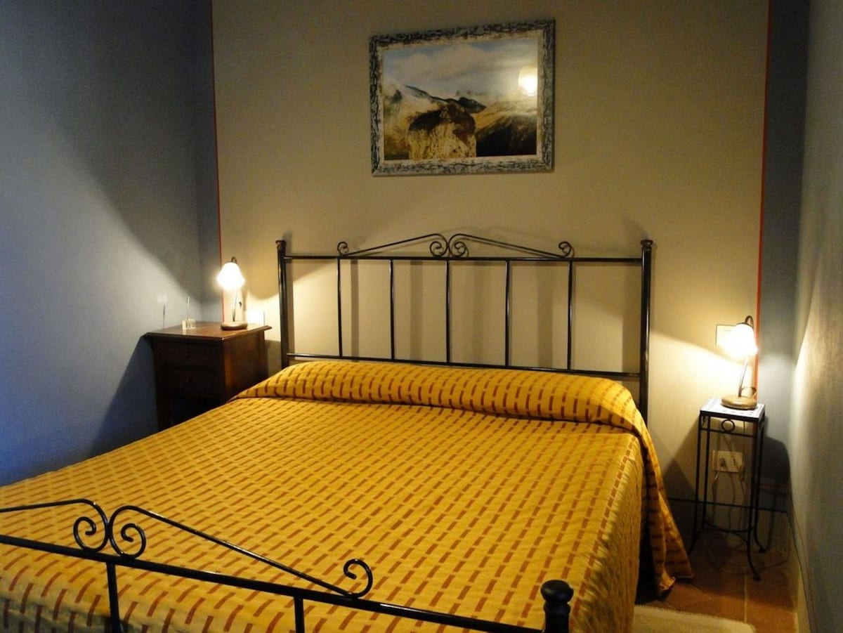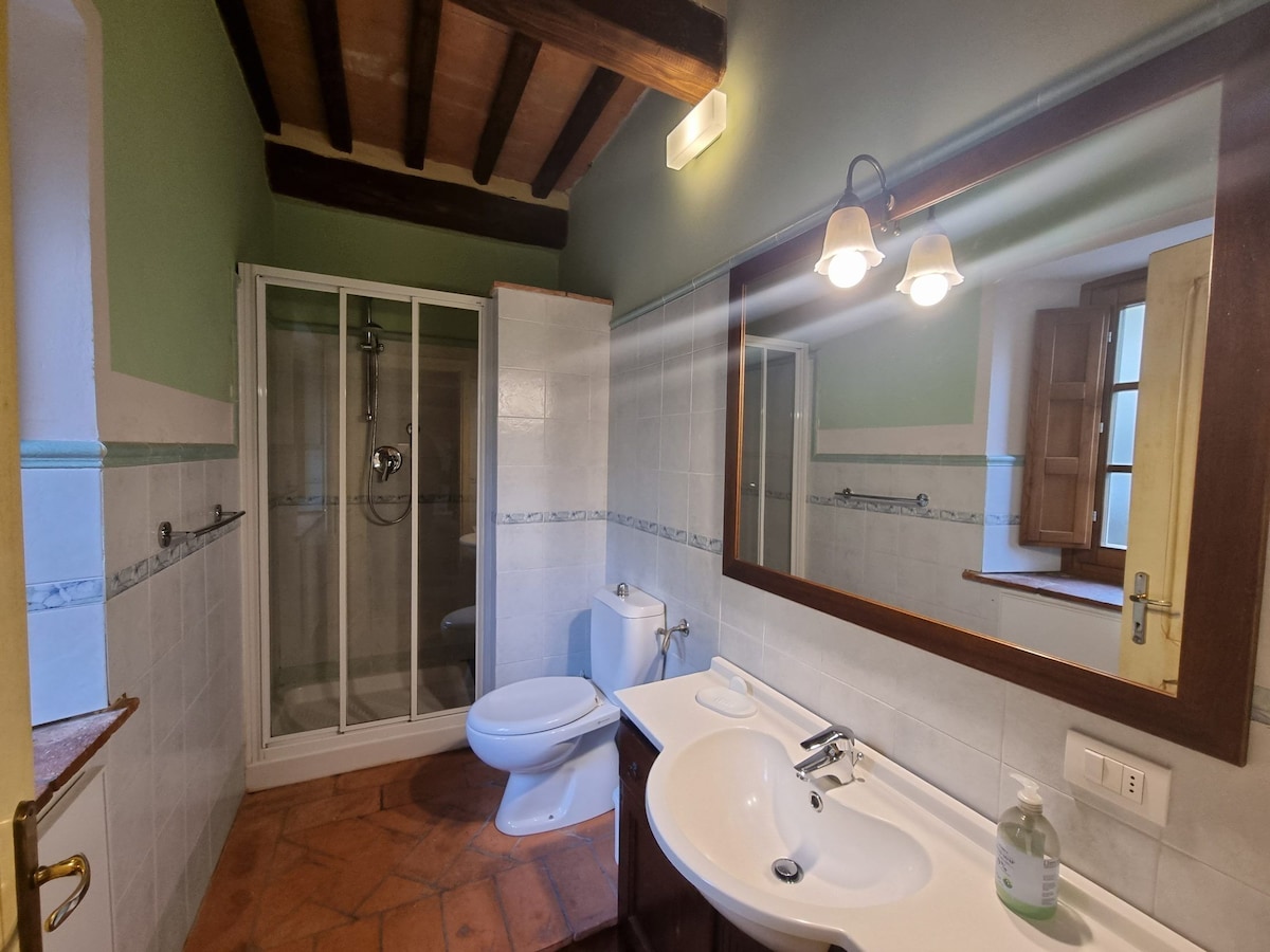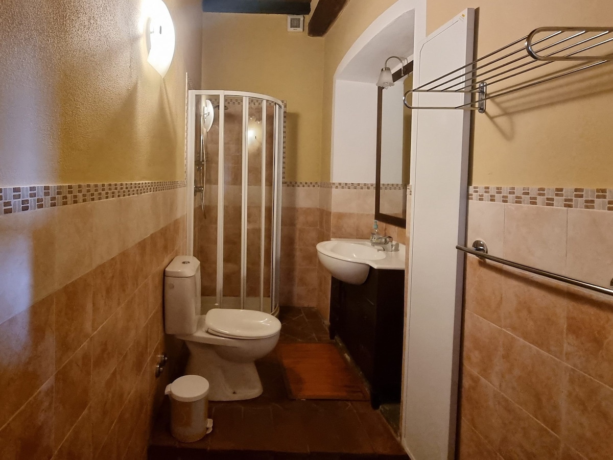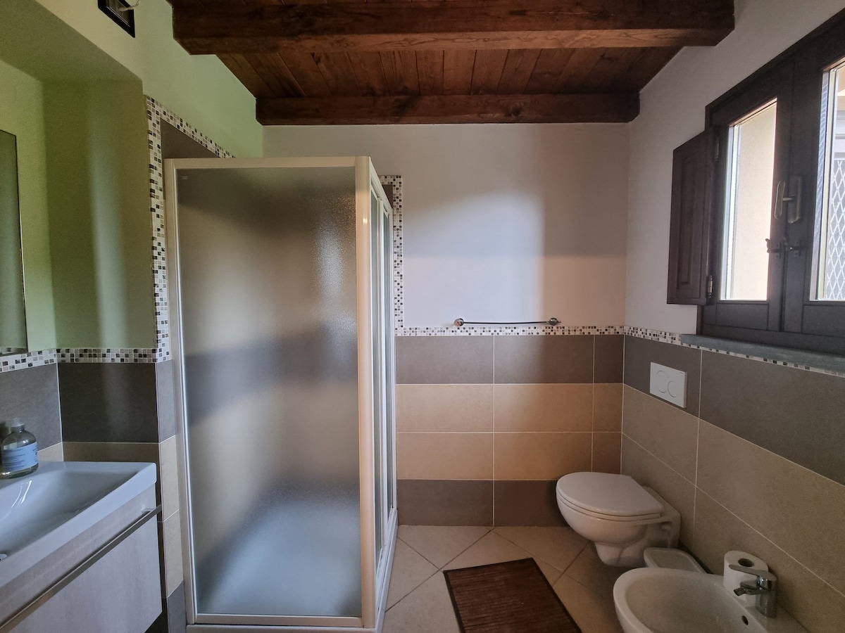 The bathroom is tiled with lucid white majolica tiles and equipped with a washbasin, a toilet, a fully enclosed shower and a hairdryer. Here you will also find an iron and an ironing board. You will be able to enter the bathroom from the living room and from the bedroom through an access area.