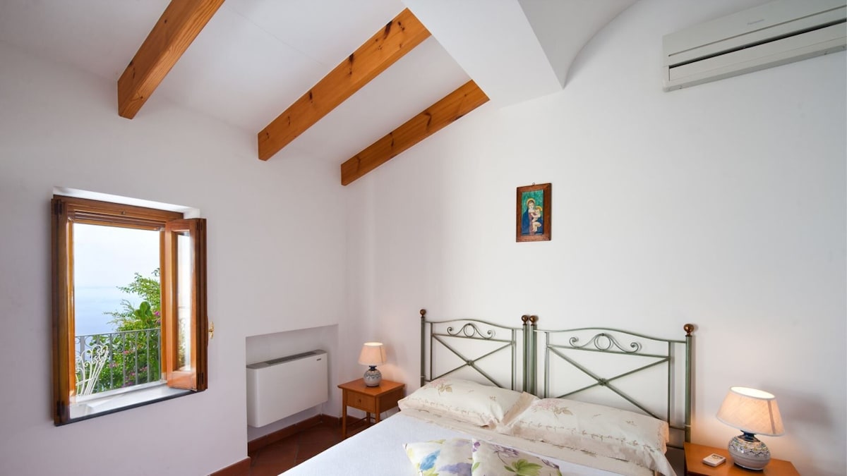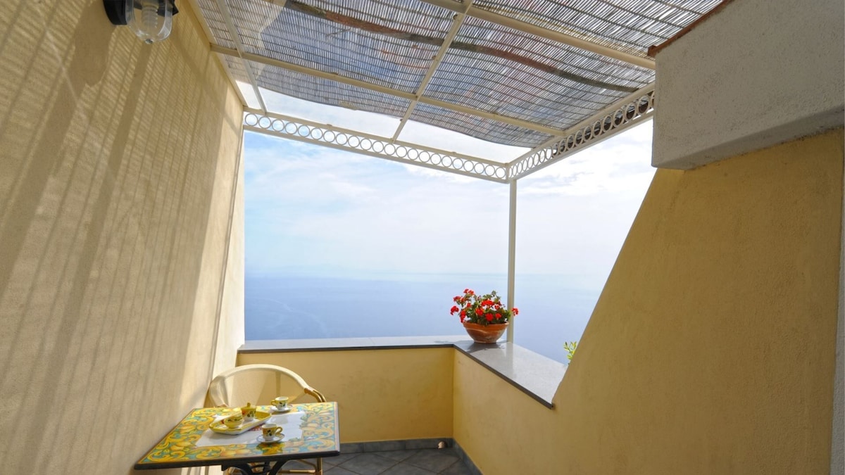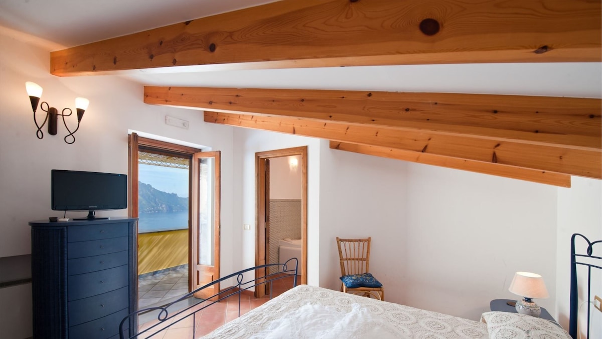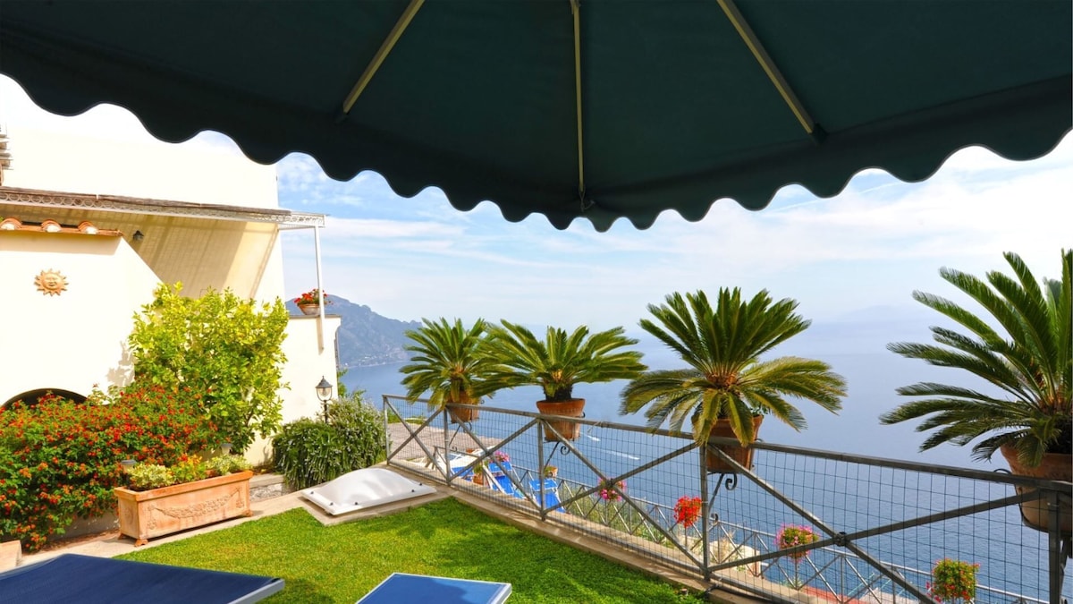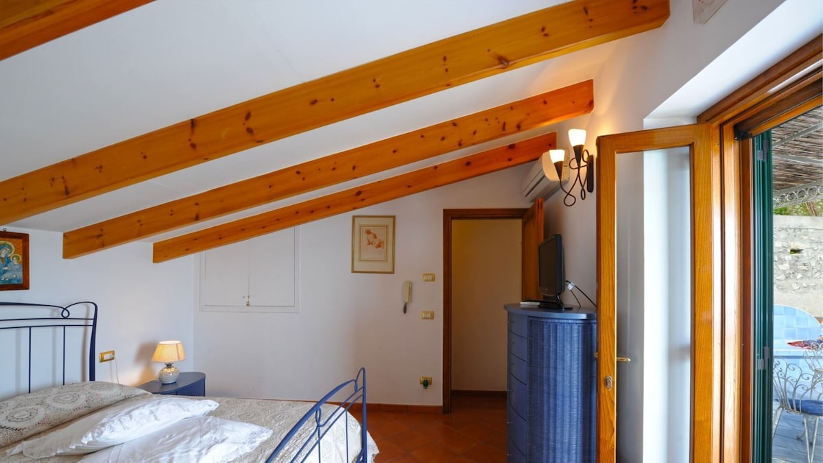 The top level: From the living room a stairway takes you to a double bedroom with an en suite bathroom equipped with shower. This bedroom opens onto a large shaded terrace with a fantastic view of the sea. An external stairway takes you from this terrace down to the lower level and lawn. The Villa is provided with an air conditioning system.