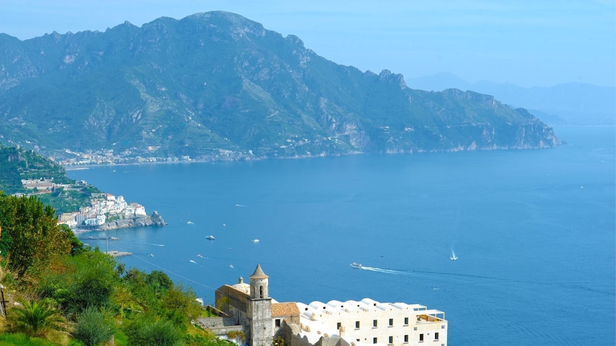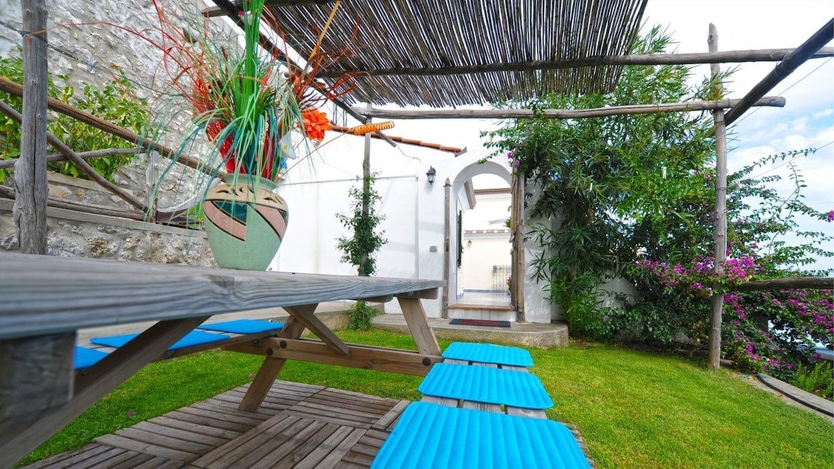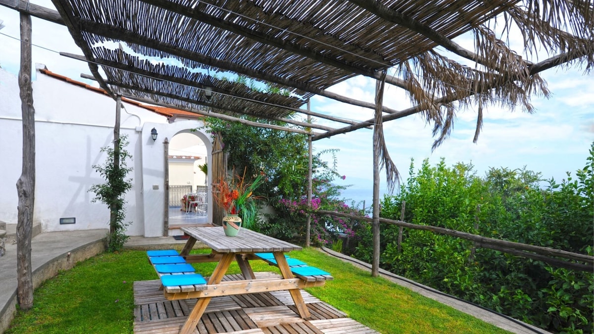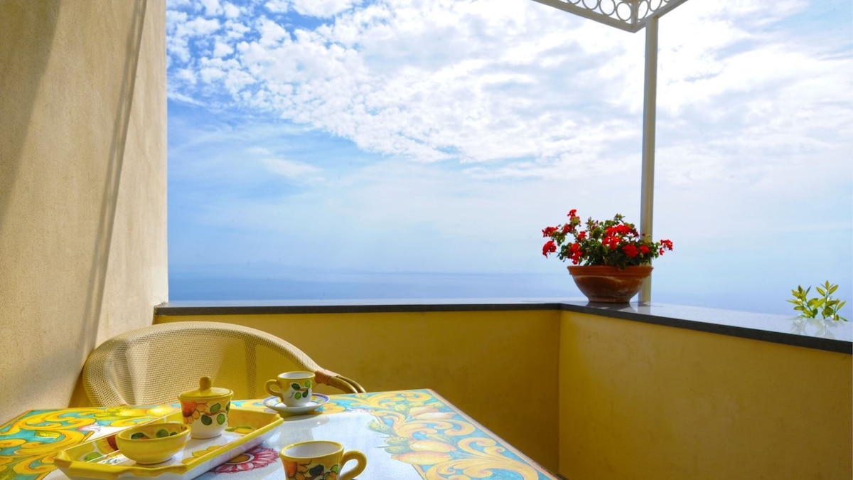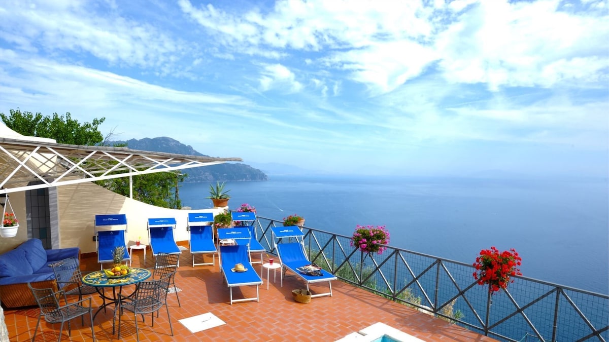 The top level: From the living room a stairway takes you to a double bedroom with an en suite bathroom equipped with shower. This bedroom opens onto a large shaded terrace with a fantastic view of the sea. An external stairway takes you from this terrace down to the lower level and lawn. The Villa is provided with an air conditioning system.