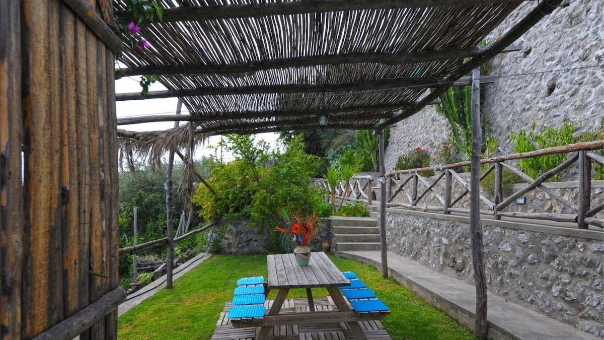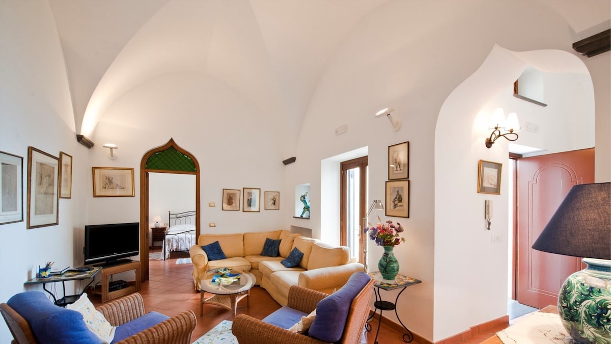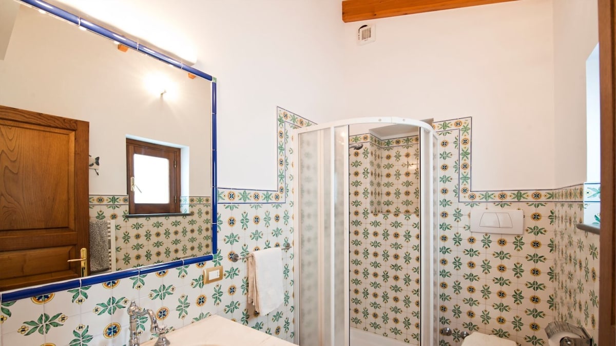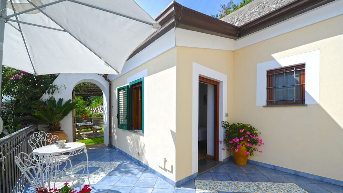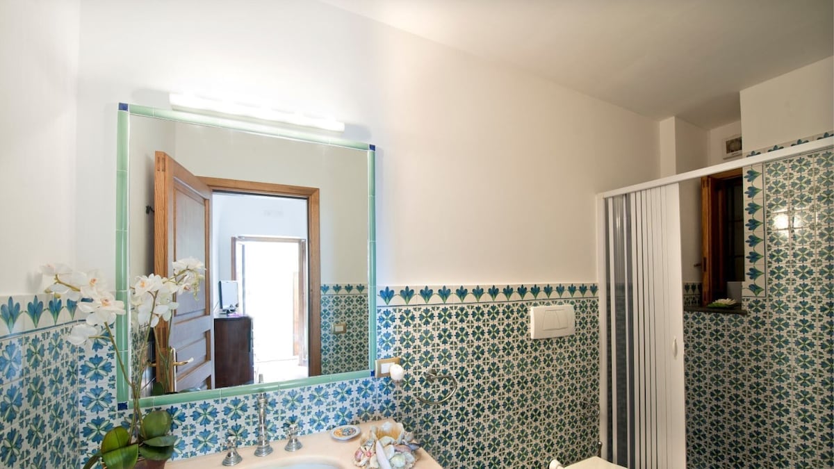 The middle level: Crossing the lawn in front of the main house, the entrance is to the right. To the left of the villa’s entrance there is a small laundry corner. To the right upon entering is the dining room with French windows which leads onto a small balcony, followed by the fully equipped kitchen. Further on is the living room with TV. From there a door leads to a double bedroom with en suite bathroom with shower. To the right of the living room is another double bedroom with outside balcony and external bathroom (washbasin, bidet, and toilet).